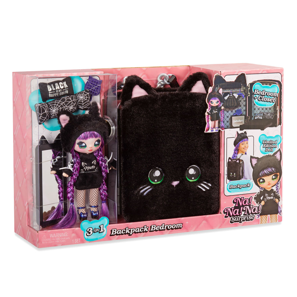 Pak de meest modieuze speelset voor je poppen uit met de Na! Na! Na! Surprise Backpack Bedroom. Een 3-in-1 schattige, zachte speelset: een stijlvolle zwartekittenrugzak, een schattige slaapkamerspeelset met kast en Tuesday Meow, een Limited-Edition-modepop. De rugzak is zacht en pluizig, met een uiterlijk dat perfect past bij het kat-rakter van Tuesday. Open hem om een slaapkamerspeelset te onthullen met een echte spiegel, uitklapbaar bed, kast met echt werkende laden, kussens, deken en kledinghangers. Alles met lieve kittendetails. Inclusief een beweegbare, zachte Limited Edition-modepop: Tuesday Meow. Ze heeft prachtig, lang haar, een pluizige kitten hoed en ze draagt een exclusieve outfit en schoenen. Als je klaar bent met spelen, pak je alles weer in en neem je de rugzak onderweg mee. Twee stijlen om te verzamelen.