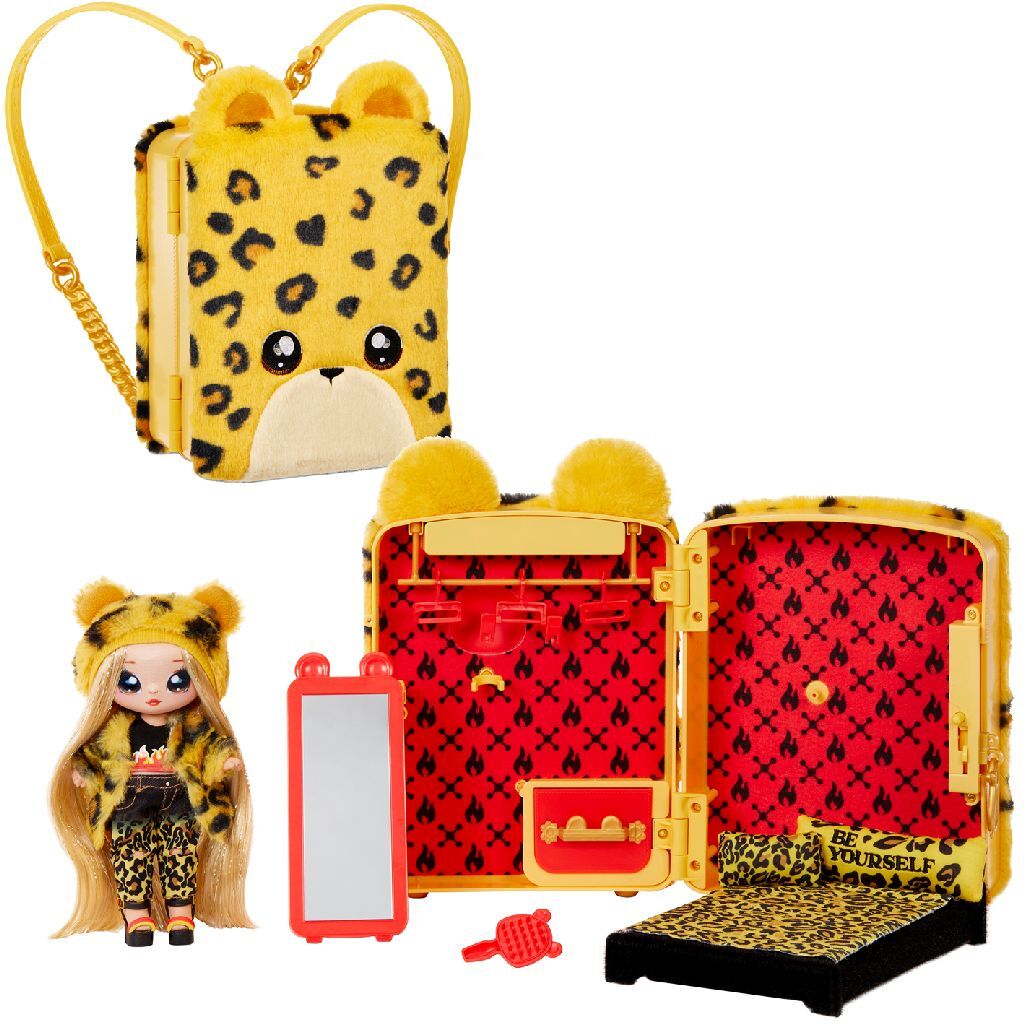 Pak de meest modieuze speelset voor je poppen uit met de Na! Na! Na! Surprise-rugzak-slaapkamer. Deze schattige, zachte speelset is 3-in-1: een stijlvolle jaguarrugzak, een schattige slaapkamerspeelset met kast en Jennel Jaguar, een limited edition-modepop. De rugzak is zacht en pluizig, met een look die perfect past bij Jennels persoonlijkheid. Open hem om een slaapkamerspeelset te onthullen met een echte spiegel, uitklapbaar bed, kast met echt werkende laden, kussens, deken en kledinghangers. Allemaal met jaguardetails. Inclusief een beweegbare, zachte limited edition-modepop: Jennel Jaguar. Ze heeft prachtig, lang haar, een pluizige jaguarmuts en ze draagt een exclusieve outfit en schoenen. Als je klaar bent met spelen, pak je alles weer in en neem je de rugzak onderweg mee. Twee stijlen om te verzamelen.
