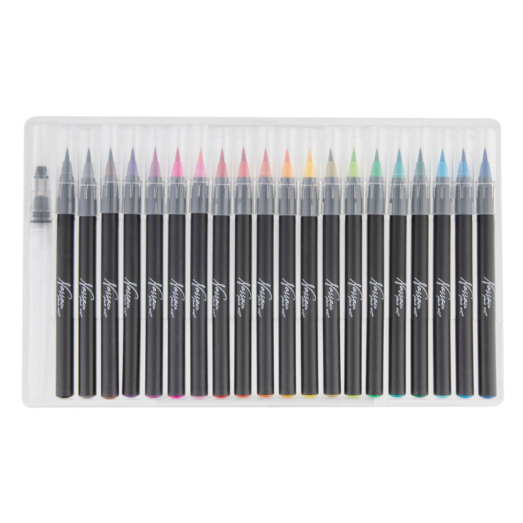 20 aquarel Brush penseelstiften en 1 waterbrush. Afmeting verpakking: 30,6 bij 14 bij 3,5 cm.