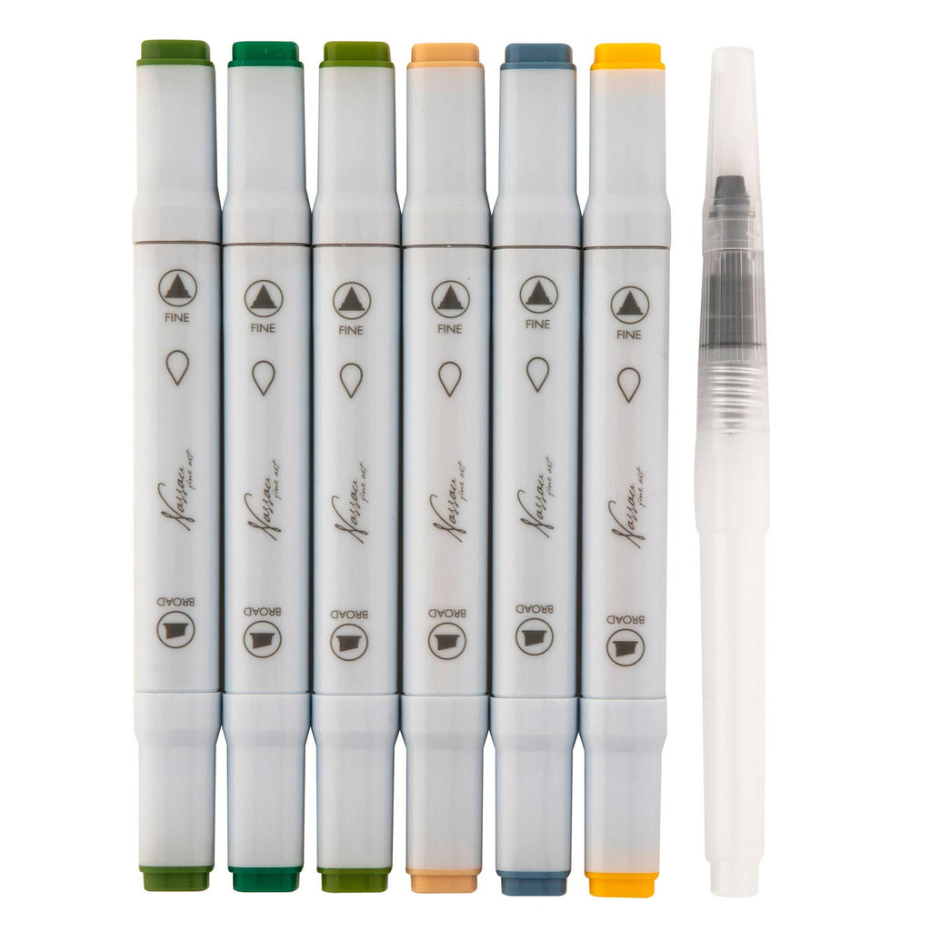 6 stuks Nassau aquarel markers in boskleuren. 2 tips, een brede en een fijne. 3 kleuren groen, oranje, blauw en geel. 16 bij 12 bij 2 cm. Geschikt vanaf 6 jaar.