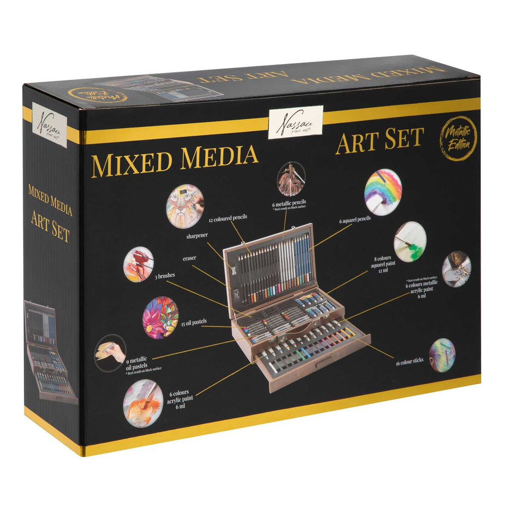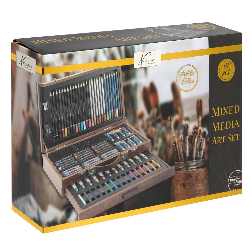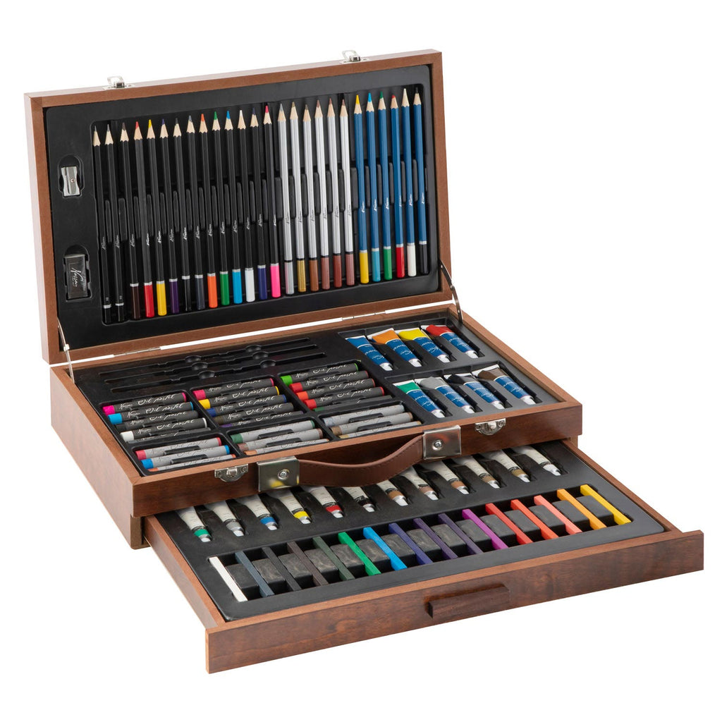 Nassau Luxe Kunstset Creatief in Houten Koffer, 91-delig: kleurpotloden, aquarelpotloden, waskrijtjes, aquarelverf, acrylverf, penselen, krijtjes, een puntenslijper en een gum.