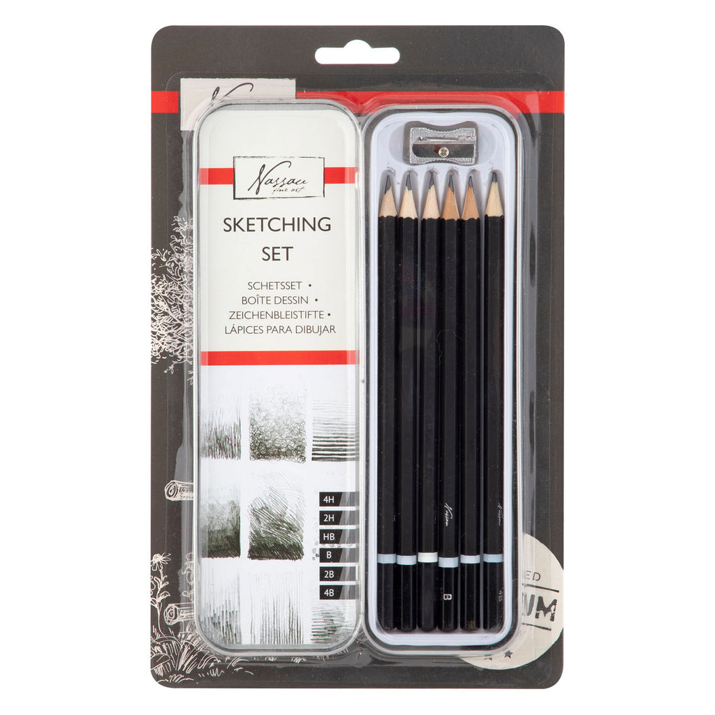 Potlodenset met puntenslijper in blik. Codes van de potloden: 4H, 2H, HB, B, 2B en 4B.