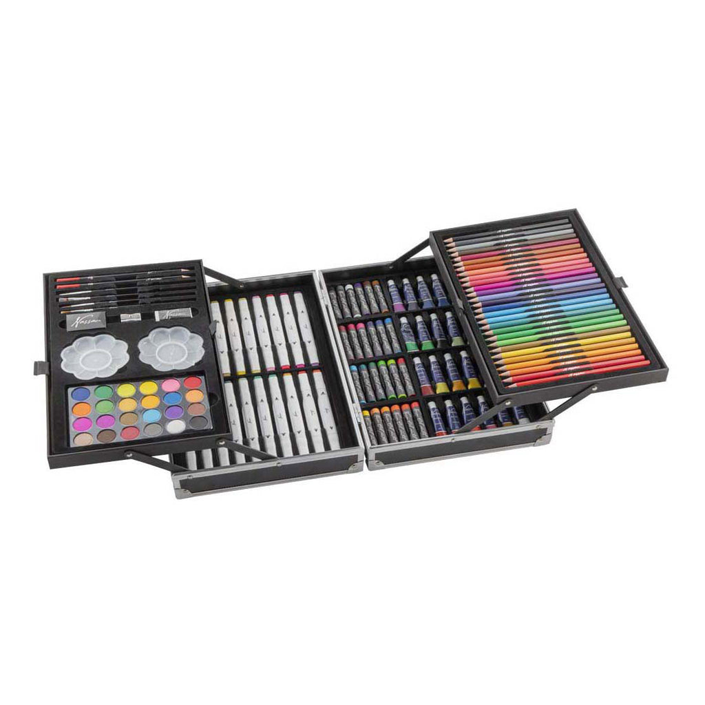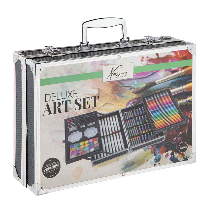 De Nassau schilderkoffer bevat 132 onderdelen zoals kleurpotloden, stiften, verf, penselen en meer. Alles netjes opgeborgen in een stevige koffer met handvat. Geschikt voor kinderen vanaf 6 jaar oud.