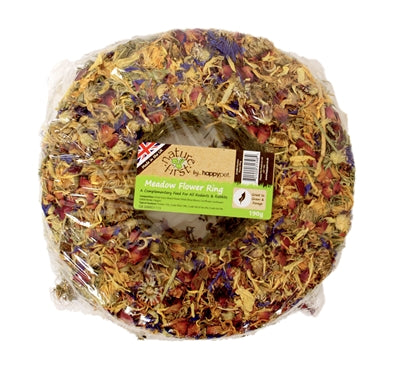 De Nature First Ring Met Weidebloemen 20 cm is aanvullend diervoeder voor knaagdieren en konijnen, een heerlijke knaagring van gedroogd gras en bloemblaadjes.