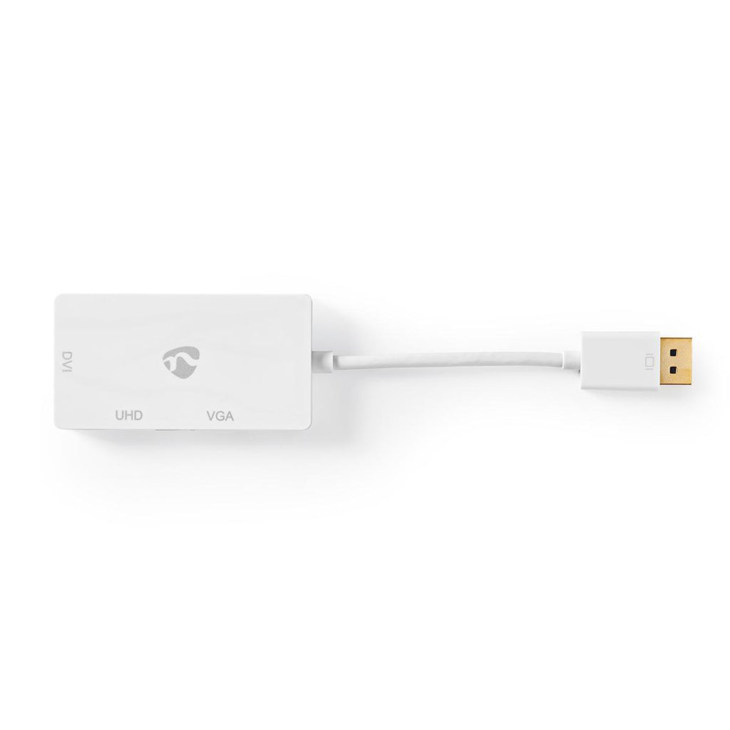 Sluit een scherm op je notebook aan met deze Nedis® DisplayPort-adapterkabel. De DisplayPort-connector heeft een DVI-, een VGA en een HDMI2.0-connector aan het andere uiteinde. Dit is handig als je iets op een scherm wilt presenteren op een externe locatie en je weet niet welk type beeldscherm daar aanwezig is.