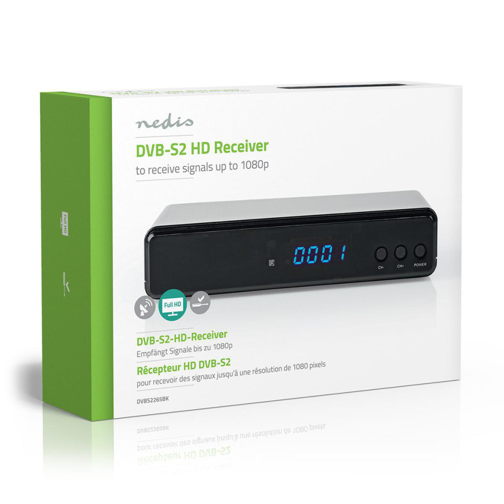 Sluit deze Nedis® high-definition DVB-S2-ontvanger aan op je TV en ontvang tot wel 1000 satellietkanalen in Full HD-beeldkwaliteit.