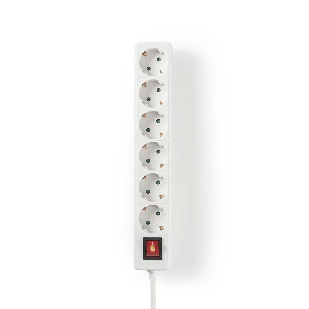 Stekkerdoos met kinderbeveiliging om een wandcontactdoos op te splitsen in zes stopcontacten. De stekkerdoos is voorzien van een knop om in één keer de stroom uit te schakelen voor alle stopcontacten; tevens is hij uitgerust met een lange kabel om elektrische apparaten overal in huis of op kantoor van stroom te voorzien.