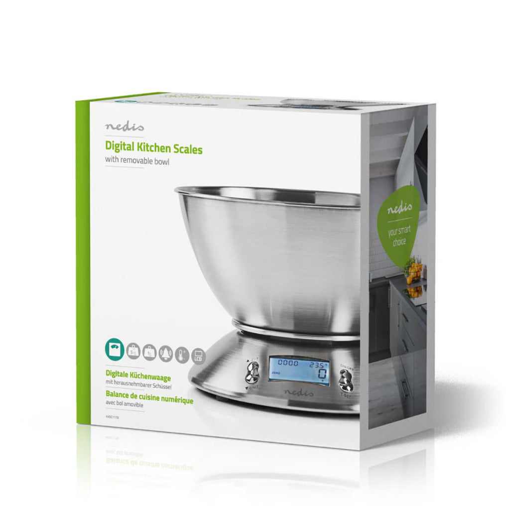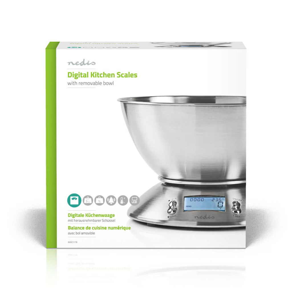 Digitale keukenweegschaal met ingebouwde thermometer en timer om ingrediënten tot maximaal 5 kilogram af te wegen. Wordt geleverd met een eenvoudig te reinigen, afneembare roestvrijstalen kom.