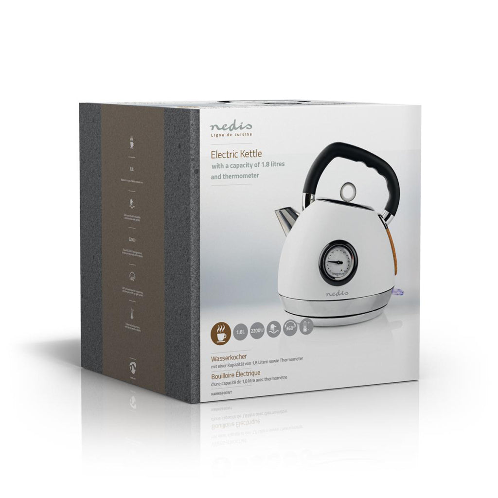 Deze stijlvolle, krachtige Nedis® elektrische waterkoker werkt even goed als hij eruit ziet: hij heeft een royale capaciteit van 1,8 liter, is snel aan de kook en de kalkaanslag is minimaal.