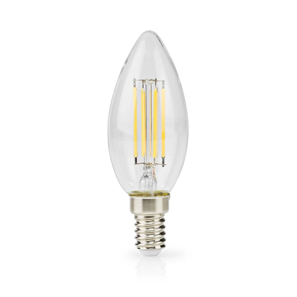 Candle shaped LED Filament BULB with E14 cap with 470 lumen and a low power consumption of 4,5W to replace a traditional 42W incandescent lamp. This energy efficient LED bulb spreads a warm white light with a colour temperature of 2700 Kelvin