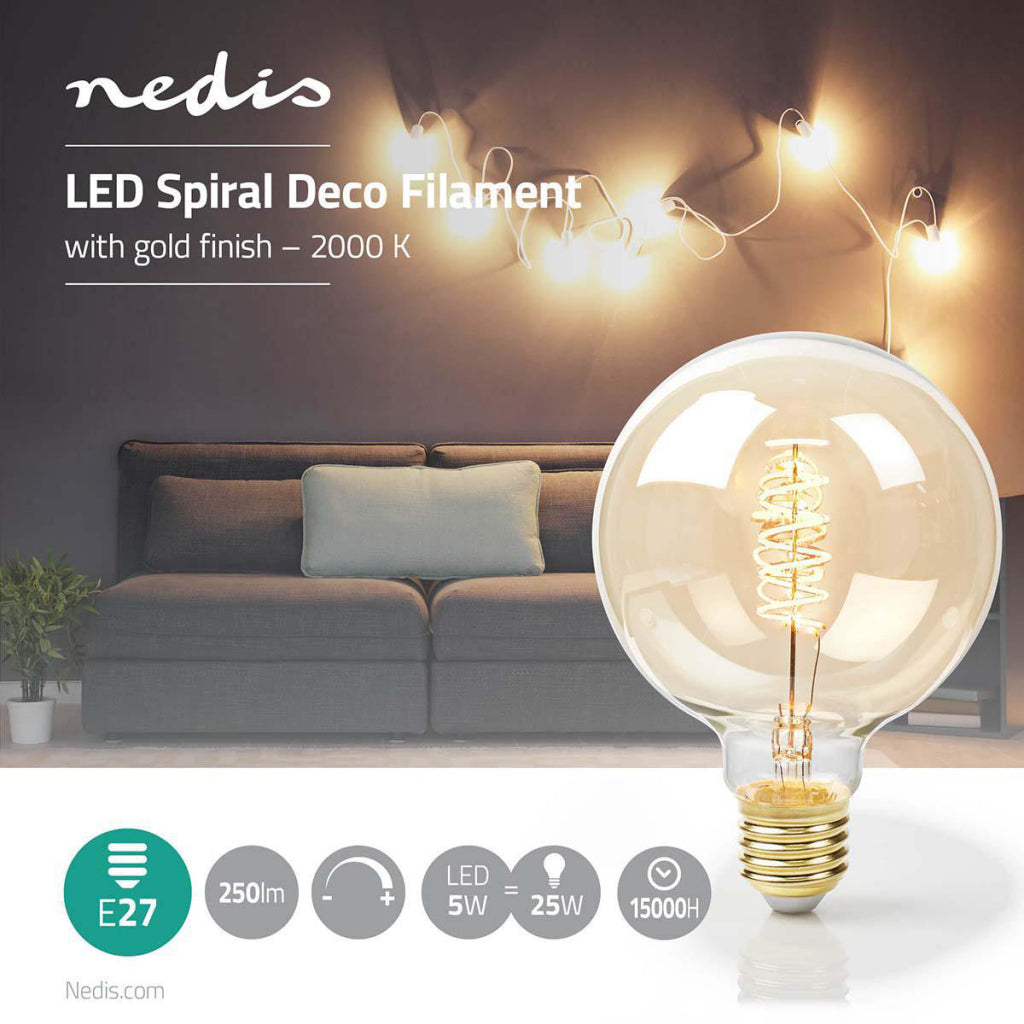 De lamp heeft een zeer brede stralingshoek van 330° en een vol, warm wit licht (2000 K). De spiraalvorm en het goudkleurige gerookte glas versterken het karakteristieke design en zorgen voor een prachtige lichtverdeling.