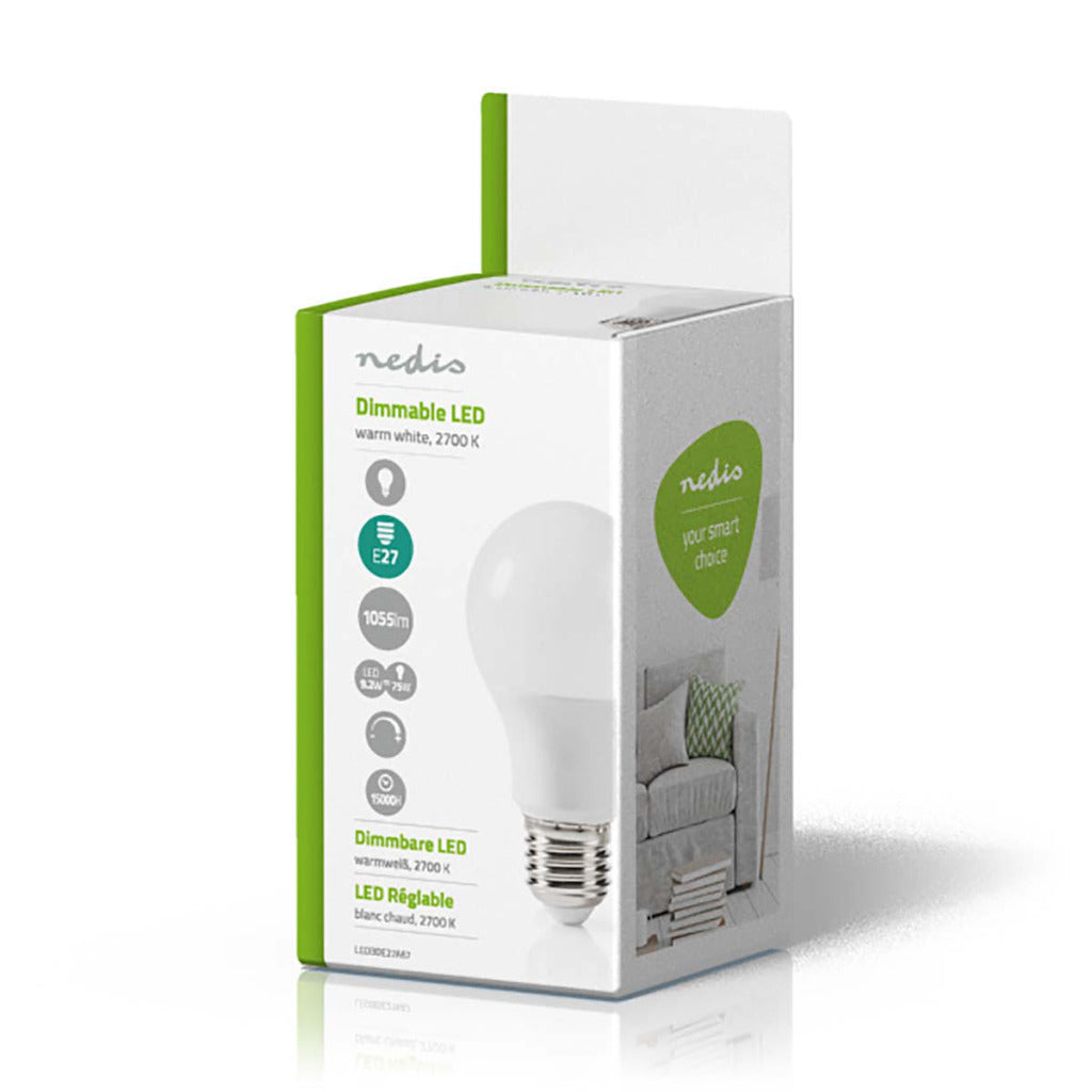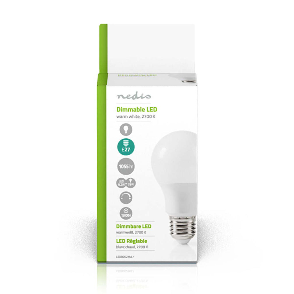 Dimbare, A60-vormige LED-lamp met E27-kap, 1 055 lumen en een zeer laag energieverbruik van 9,2 watt, ter vervanging van de traditionele 75-watt gloeilampen en voor directe energiebesparing.