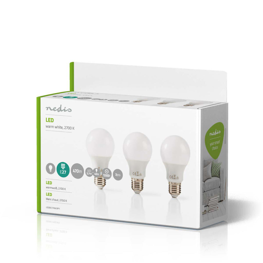 A60-vormige LED-lamp met E27-fitting, 470 lumen en een extreem laag energieverbruik van 5,3 watt, ter vervanging van traditionele 40-watt gloeilampen en voor directe energiebesparing.
