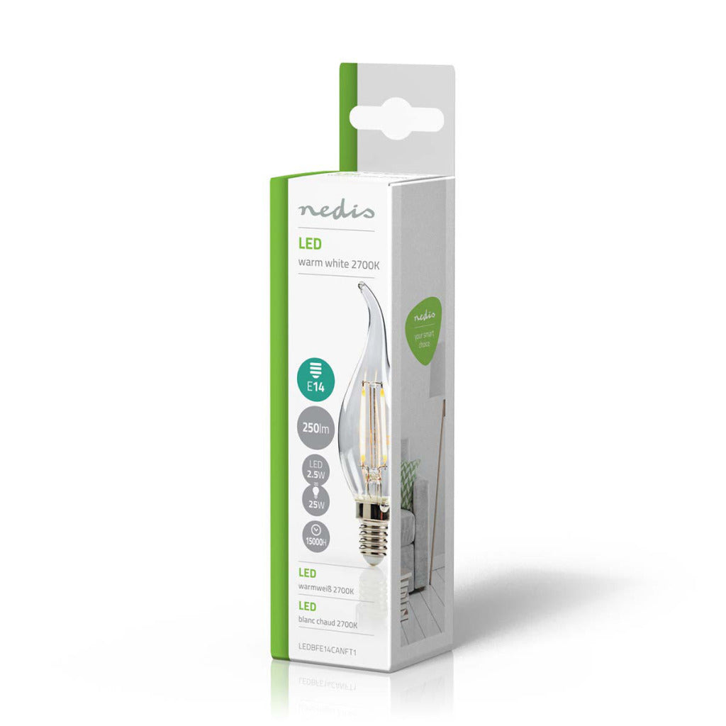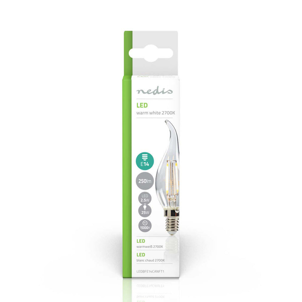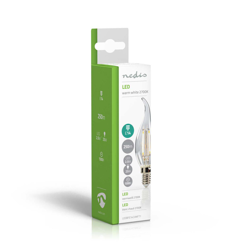 Retro Vlamvormige filament LED-lamp en E14-fitting, 250 lumen en een zeer laag energieverbruik van 2.1 watt, ter vervanging van de traditionele 25-watt gloeilampen en voor directe energiebesparing. Deze lamp bespaart zelfs meer energie dan traditionele LED-lampen. De lamp verspreidt een warm wit licht met een kleurtemperatuur van 2700 kelvin.