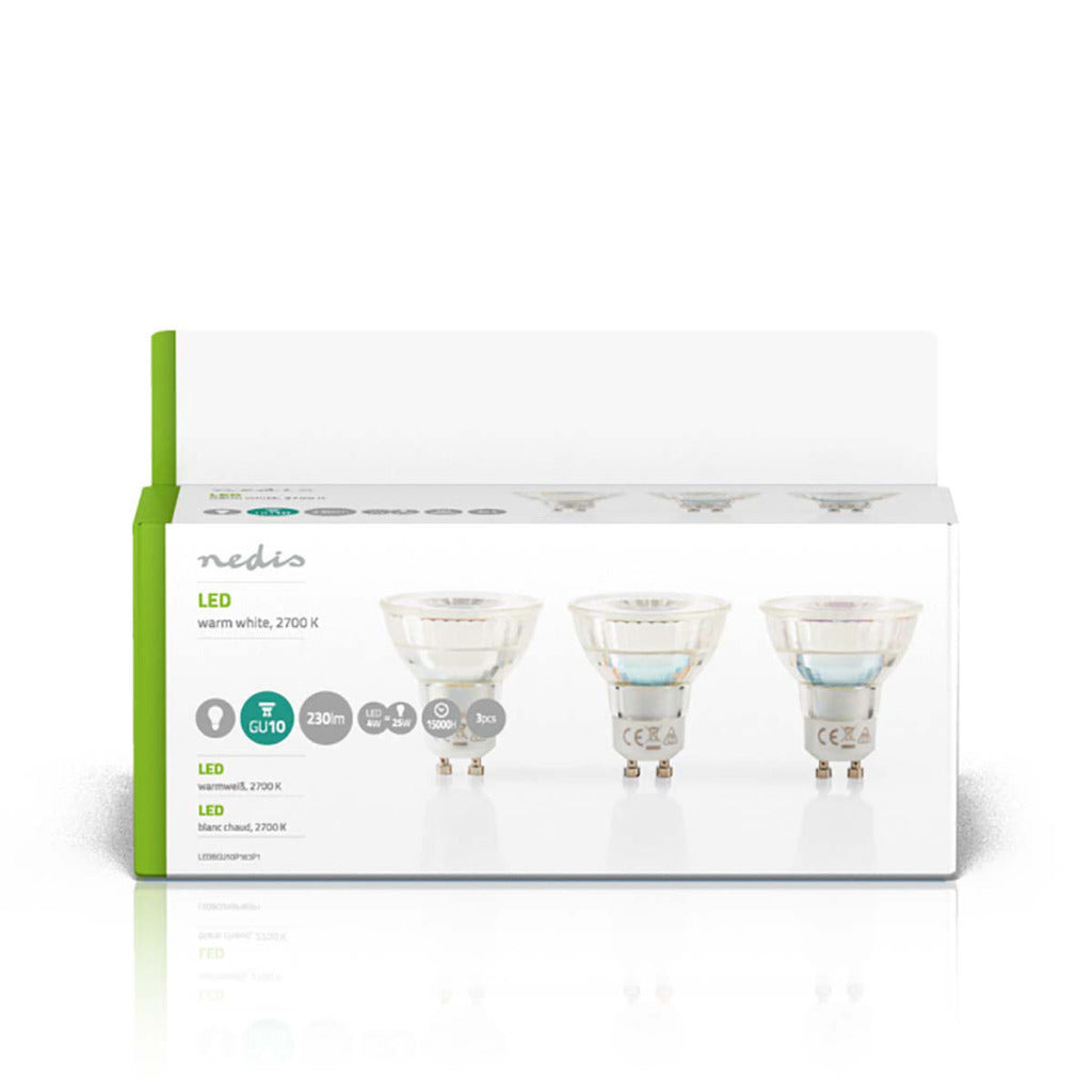 MR16-vormige LED-lamp met GU10-fitting, 230 lumen en een extreem laag energieverbruik van 3.5 watt, ter vervanging van traditionele 35-watt gloeilampen en voor directe energiebesparing.