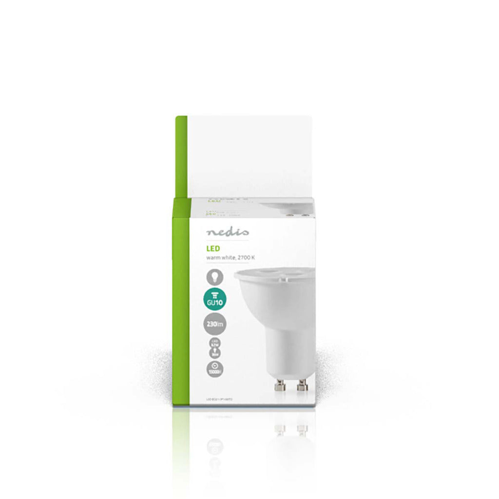 PAR16-vormige LED-lamp met GU10-kap, 230 lumen en een zeer laag energieverbruik van 4 watt, ter vervanging van de traditionele 35-watt gloeilampen en voor directe energiebesparing.