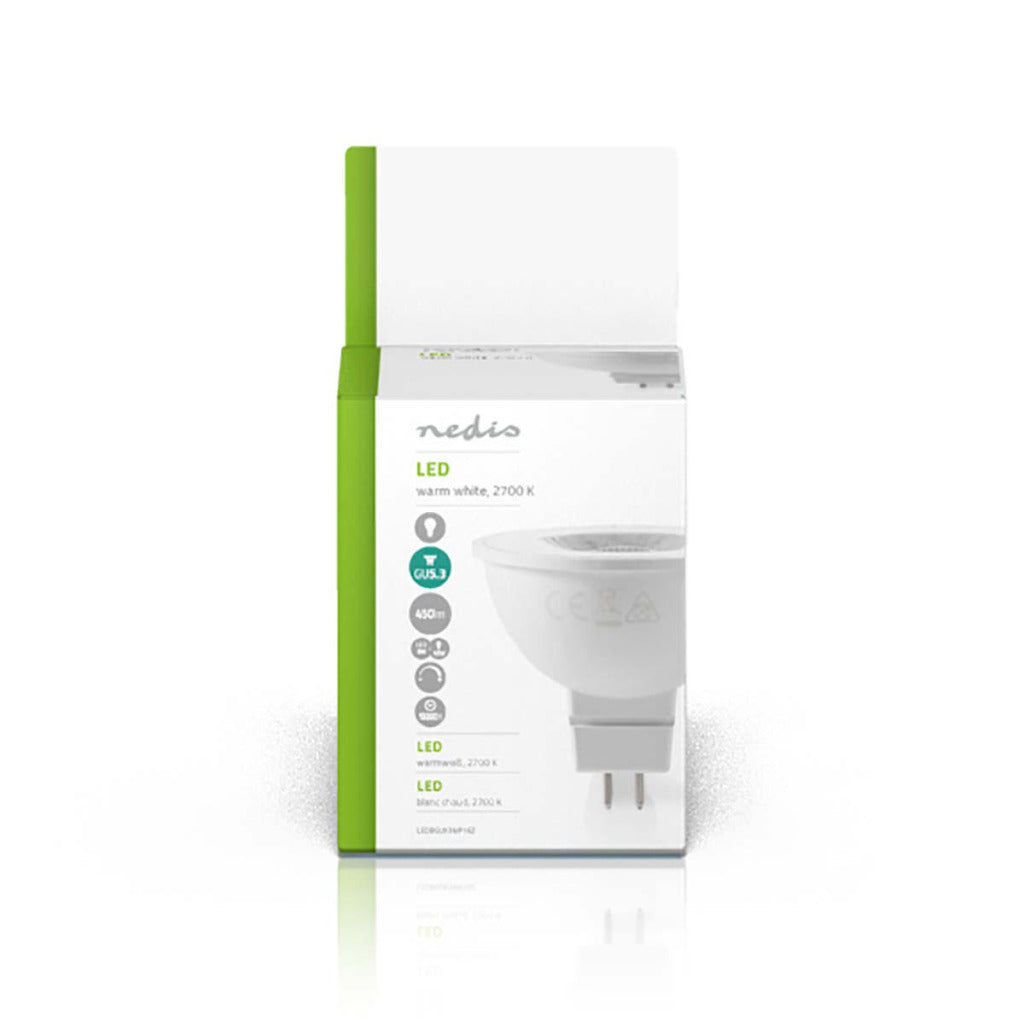 MR16-vormige LED-lamp met GU5.3-kap, 450 lumen en een zeer laag energieverbruik van 6 watt, ter vervanging van de traditionele 35-watt gloeilampen en voor directe energiebesparing.