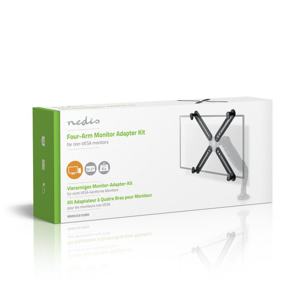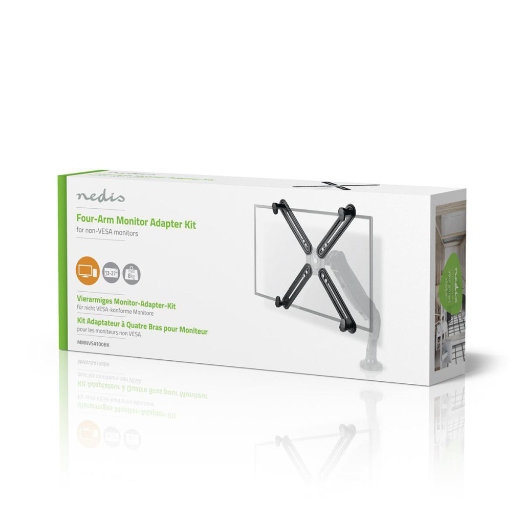 Deze Nedis® vierarmige monitor-adapterkit biedt een innovatieve bevestigingsoplossing. Je monteert er een beeldscherm mee aan een monitorbureau of muurbeugel terwijl het beeldscherm niet VESA-geschikt is.