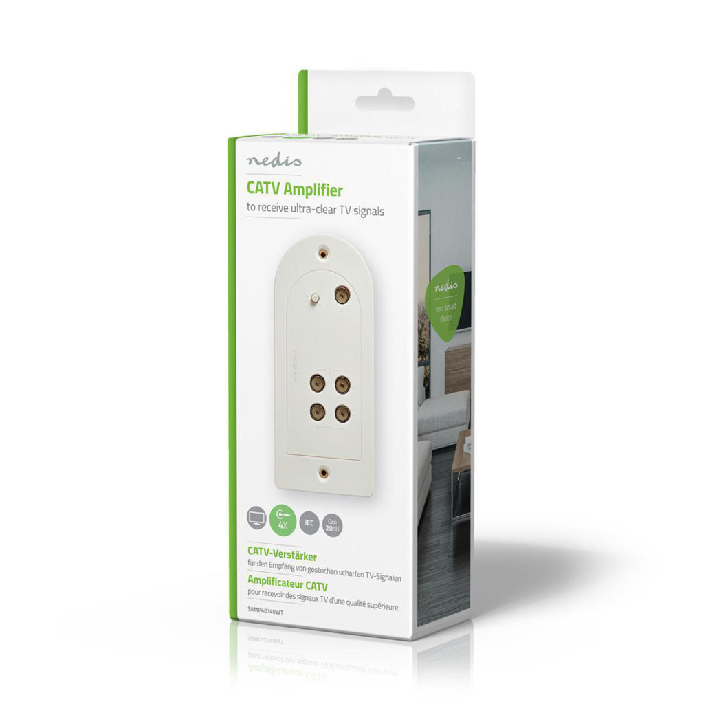 Deze CATV-versterker met versterkingsregeling heeft vier uitgangen. Sluit hem aan op je televisieset voor ultraheldere TV-signalen met een versterking van 20 dB.