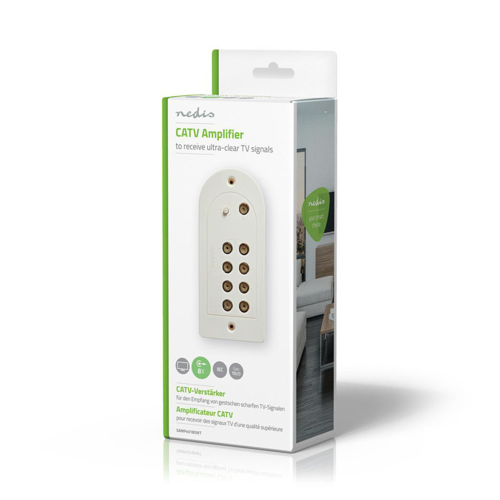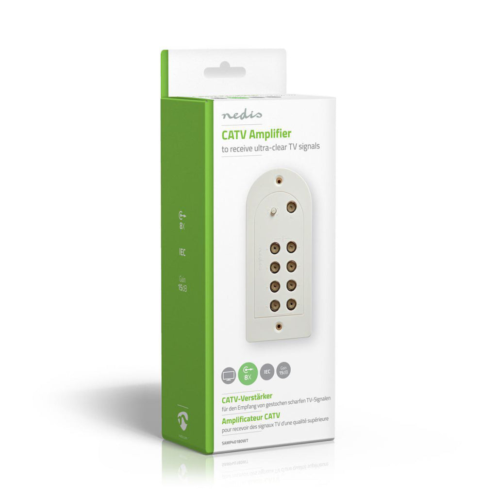 Deze CATV-versterker met versterkingsregeling heeft acht uitgangen. Sluit hem aan op je televisieset voor ultraheldere TV-signalen met een versterking van 15 dB.