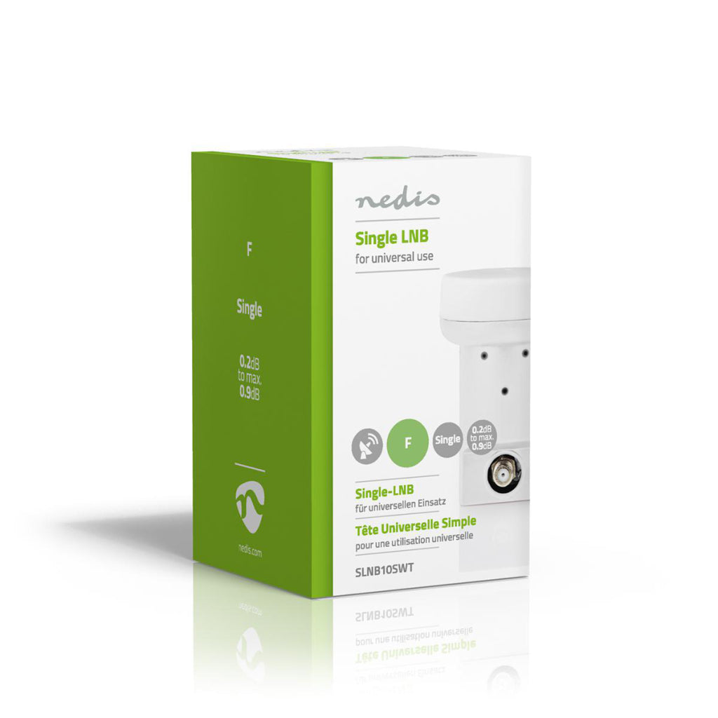 Monteer deze Nedis® single LNB op installaties die een superieure signaalsterkte- en kwaliteit vereisen. Hij vermindert het ruisgetal; deze varieert tussen 0,2 dB en 0,9 dB.