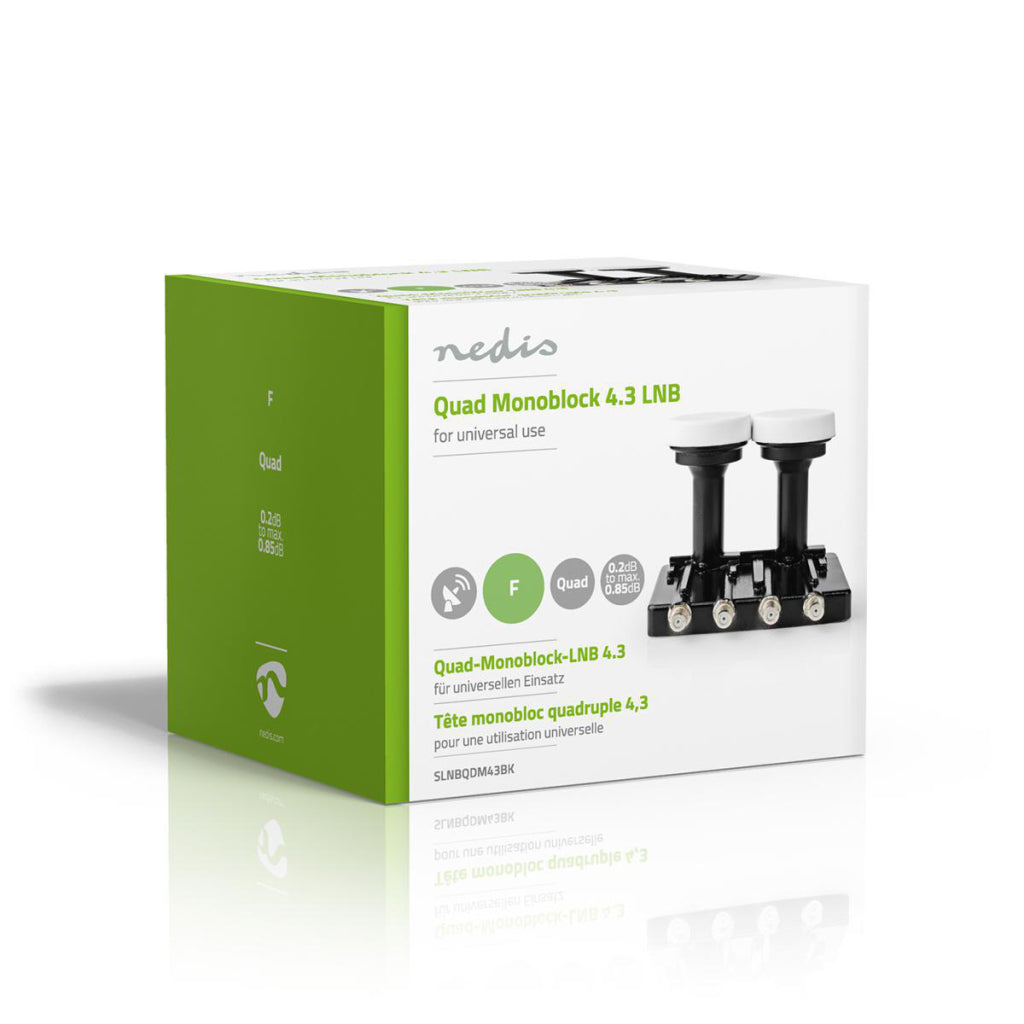 Monteer deze Nedis® LNB quad monoblock 4.3 op installaties die een superieure signaalsterkte- en kwaliteit vereisen. Hij vermindert het ruisgetal; deze varieert tussen 0,2 dB en 0,85 dB.