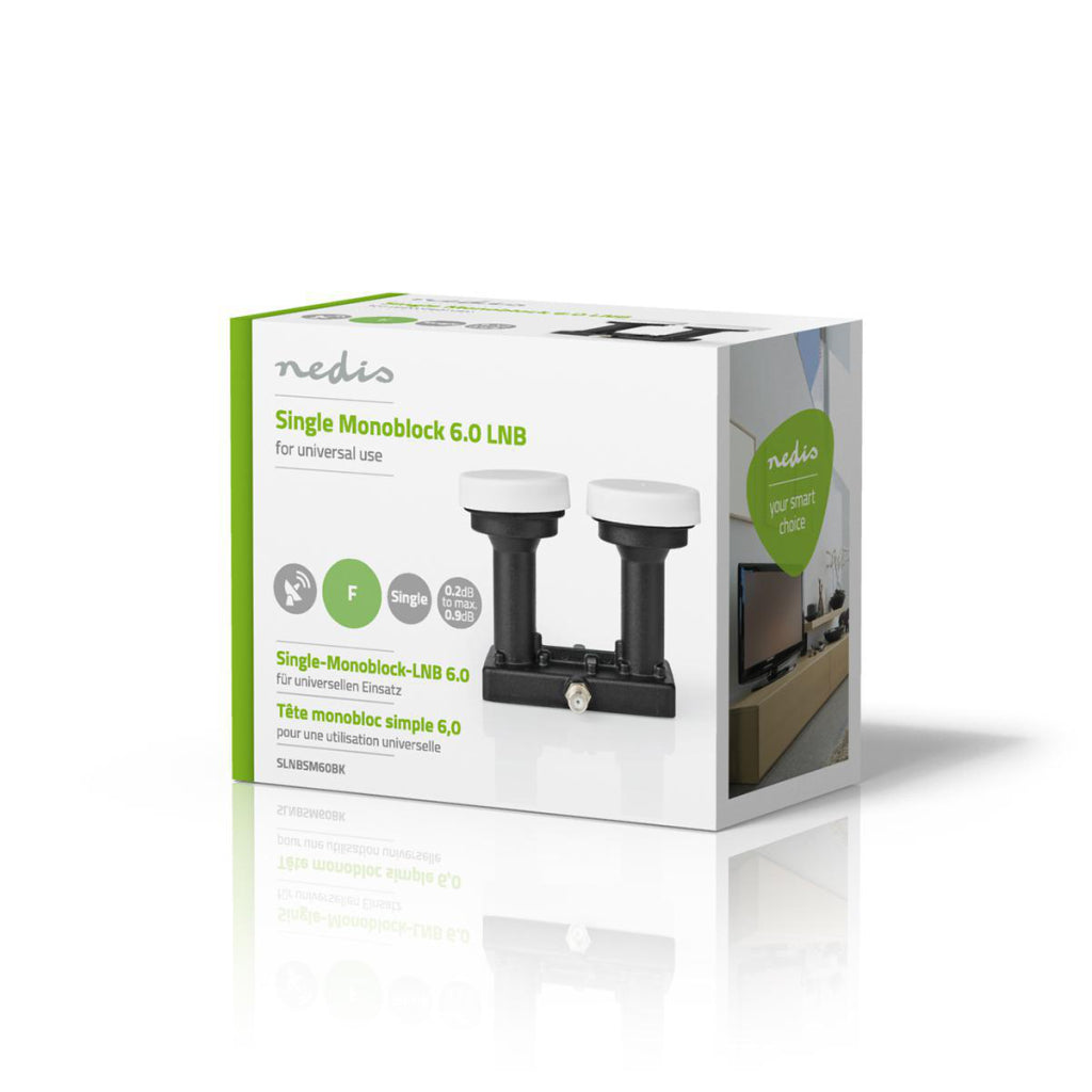 Monteer deze Nedis® LNB single monoblock 6.0 op installaties die een superieure signaalsterkte- en kwaliteit vereisen. Hij vermindert het ruisgetal; deze varieert tussen 0,2 dB en 0,9 dB.
