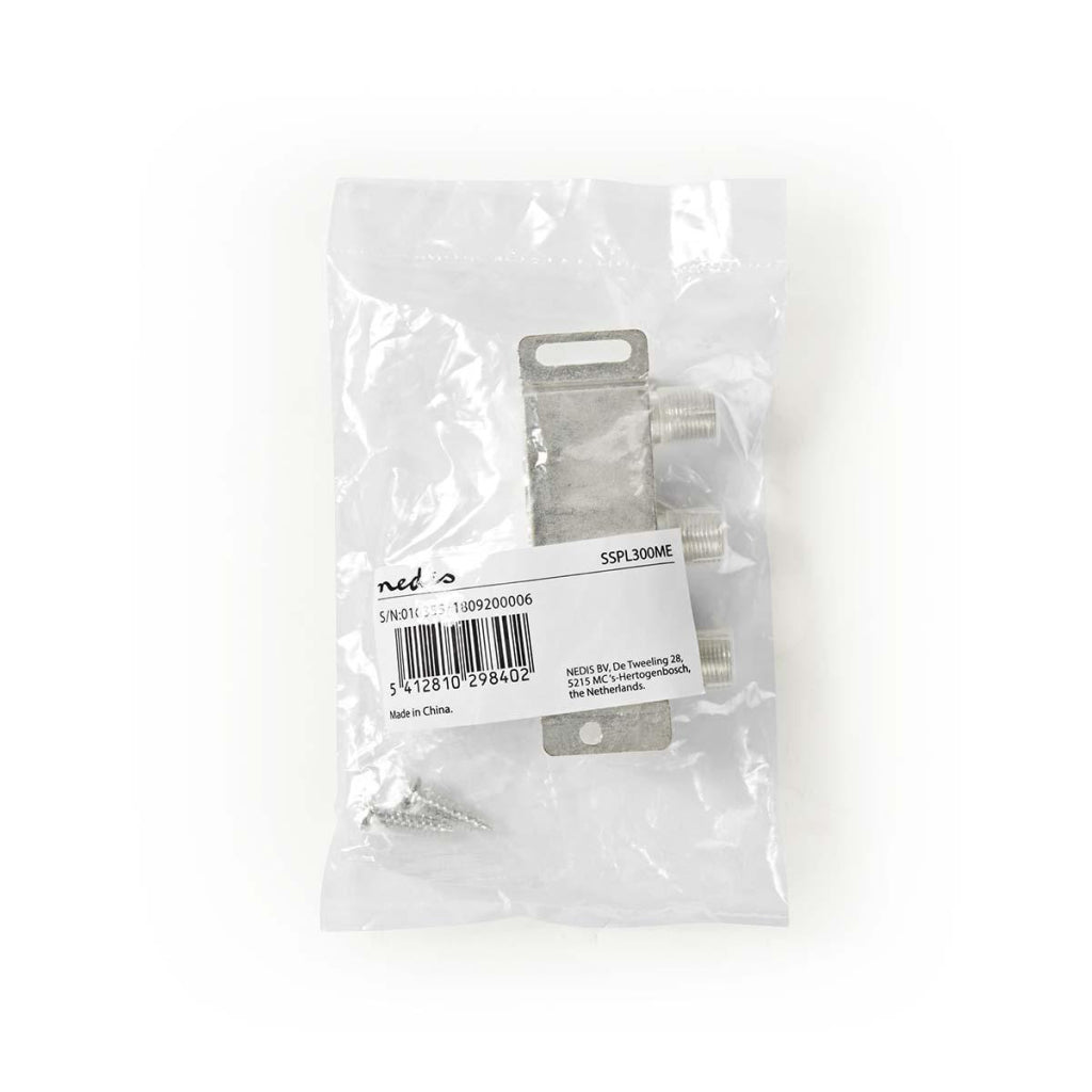 Drievoudig verdeelelement in een metalen die-cast behuizing met F-connector aansluitingen voor het verdelen van CAI signalen.
