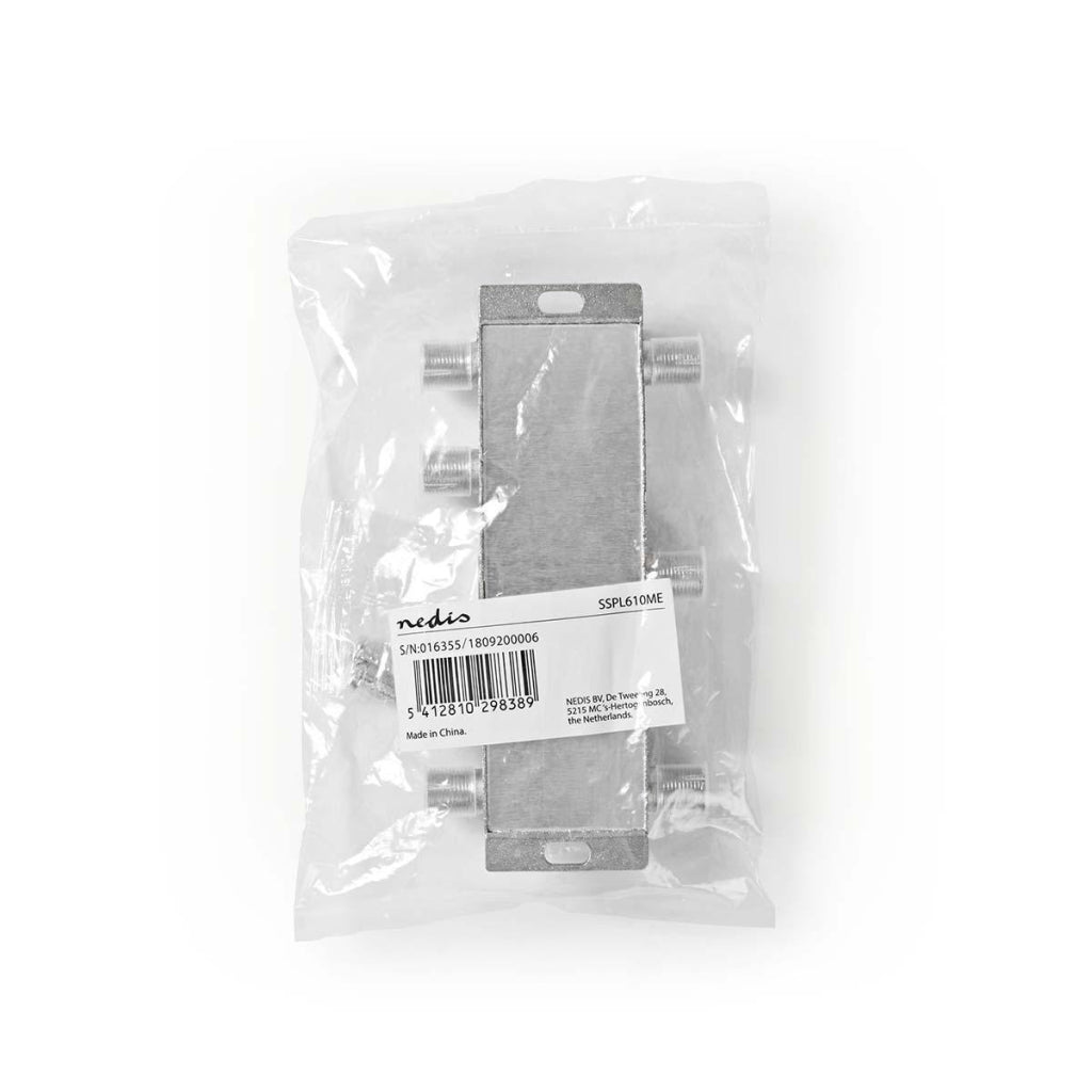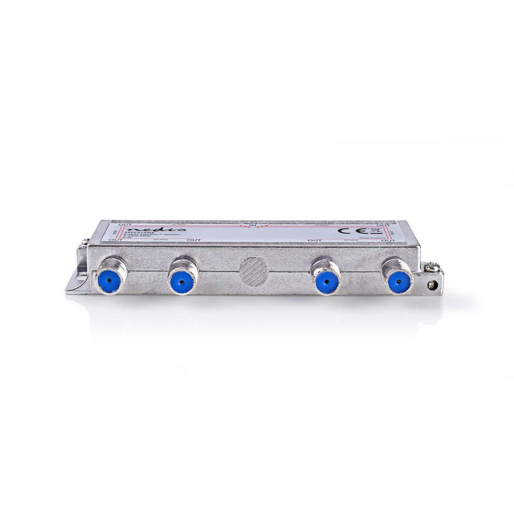 Zesvoudig verdeelelement in een metalen die-cast behuizing met satelliet DC-power pass en F-connector aansluitingen voor het verdelen van satelliet signalen.