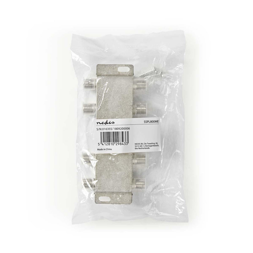 Achtvoudig verdeelelement in een metalen die-cast behuizing met F-connector aansluitingen voor het verdelen van CAI signalen.
