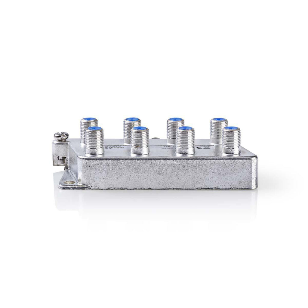 Achtvoudig verdeelelement in een metalen die-cast behuizing met satelliet DC-power pass en F-connector aansluitingen voor het verdelen van satelliet signalen.