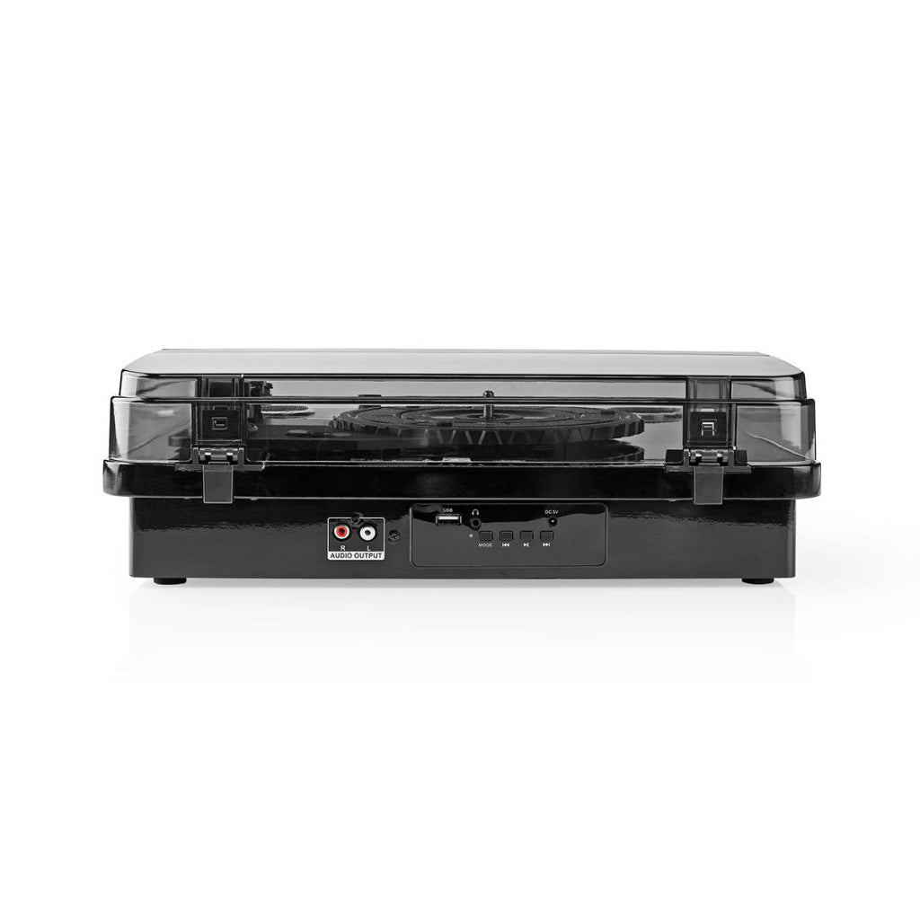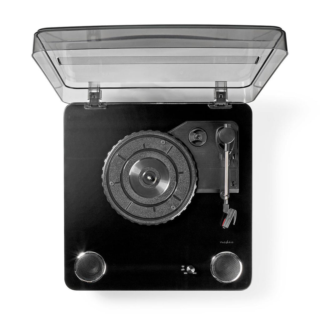 Met deze Nedis® draaitafel luister je naar je vinylcollectie en zet je die rechtstreeks vanaf het apparaat om naar digitale muziekbestanden. De ingebouwde speakers met een piekvermogen van 2x 9 W maken het mogelijk om lekker achterover te leunen en naar je platen te luisteren, zonder allerlei ingewikkelde instellingen vooraf. Dankzij de zwarte afwerking is deze draaitafel een schitterende toevoeging voor iedere ruimte. Je kunt hem zelfs aansluiten op je geluidssysteem (via de RCA-uitgang) of met je draadloze apparatuur (via Bluetooth). Deze draaitafel met snaaraandrijving speelt je hele platencollectie (33 1/3, 45 of 78 toeren) af.