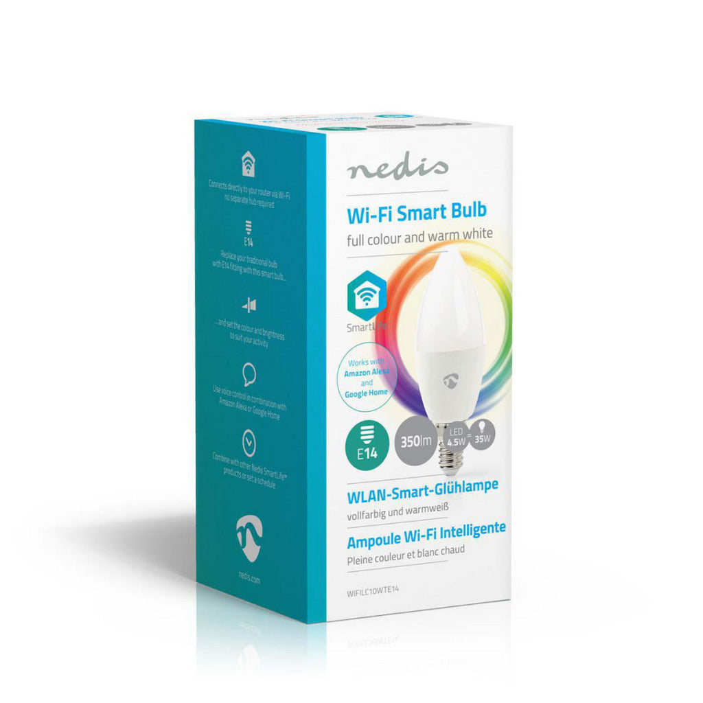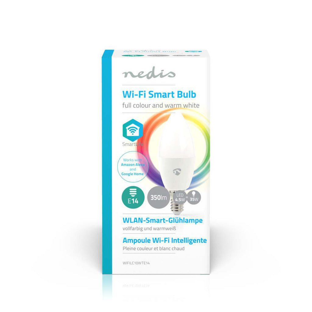 Met deze Full Colour Wireless Smart Bulb (met E14 schroeffitting) van Nedis®, die deel uitmaakt van het steeds groeiende SmartLife-assortiment, kunt u de kleur en helderheid op afstand bedienen met uw telefoon, tablet of stem (met behulp van Amazon Alexa of Google Home).