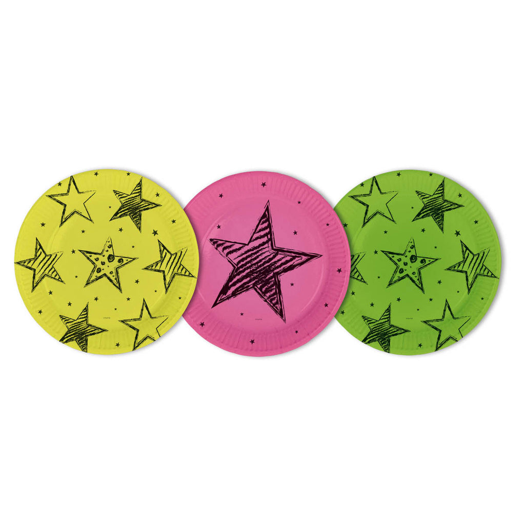 Maak je feestje compleet met deze kartonnen neon party bordjes. De set bevat 8 felgekleurde bordjes met de een ster erop.