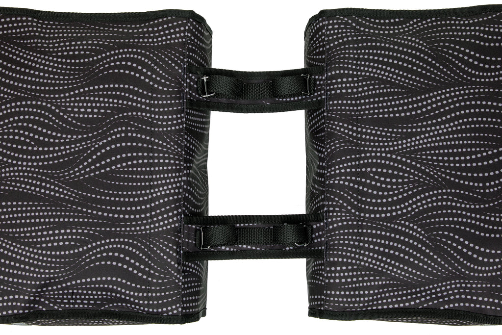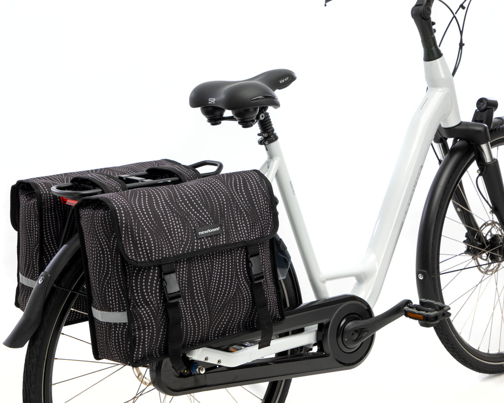 De Fiori is een eenvoudige dubbele fietstas met moderne stippenprint. De tas is compact en erg lichtgewicht. Toch kan er best wat in, want deze tas heeft een inhoud van 30 liter. Het hoofdvak sluit je met 2 klikgespen. Een voordeel van deze praktische tas is dat je de snelbinders kunt blijven gebruiken. De tas is uitgerust met reflectie aan beide kanten voor extra veiligheid in het donker. Keuze uit zwart, blauw en grijs.