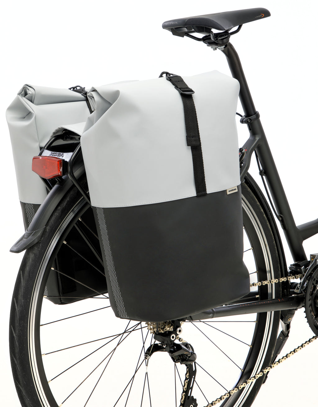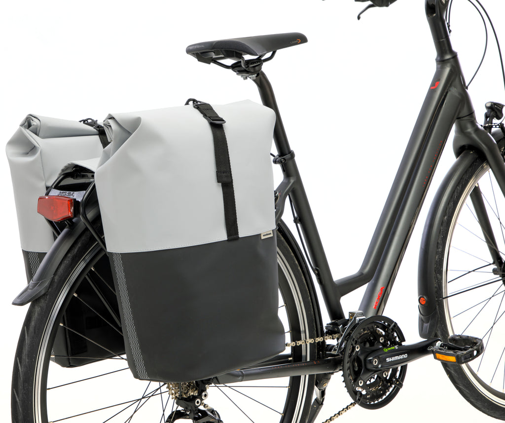De NewLooxs Nyborg is een praktische dubbele fietstas die ideaal is voor dagelijkse avonturen op de fiets. Gemaakt van waterafstotend polyester, biedt deze fietstas bescherming tegen onverwachte weersomstandigheden. Het unieke roll top sluitsysteem zorgt voor een waterdichte afsluiting, waardoor je spullen veilig en droog blijven tijdens je rit. Met afmetingen van 30 x 17 x 37 cm (2x) biedt de tas voldoende ruimte voor al je benodigdheden, en met een royale inhoud van 34 liter ben je goed uitgerust voor elke fietsavontuur. Kies voor functionaliteit en stijl met de NewLooxs Nyborg fietstas. Merk: NewLooxs Model: Nyborg Materiaal: waterafstotend polyester Afmetingen: 30 x 17 x 37 (2x) Inhoud: 34 liter Kleur: lichtgrijs/zwart