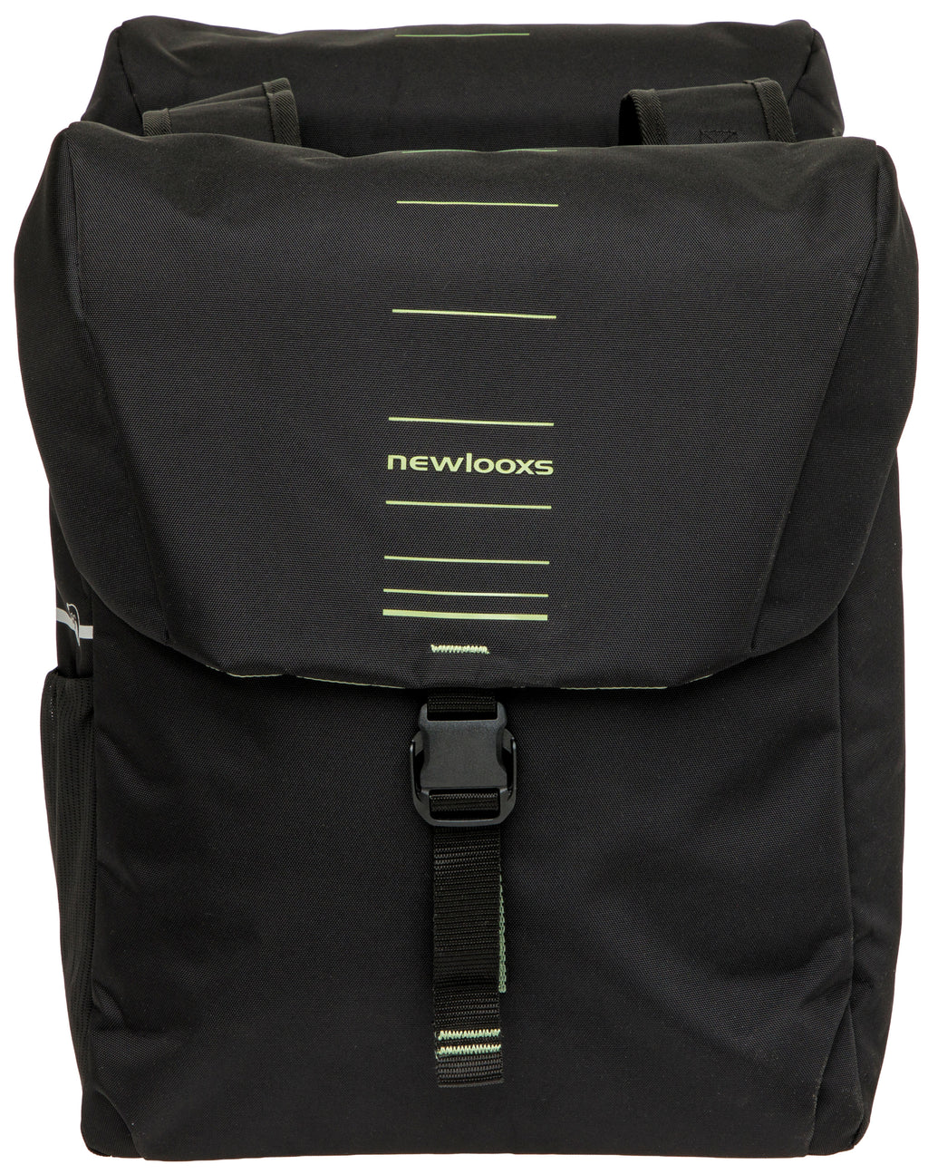 Deze populaire tas is vernieuwd en heeft een frisse look gekregen. Kan iets dat al heel goed is, nóg beter worden? Wij denken van wel! De Vigo Double is een degelijke dubbele fietstas met een sportieve uitstraling. De kleuraccenten op de tas geven de tas een frisse look. Met een handig formaat is deze moderne tas perfect voor dagelijks gebruik. Deze fietstas past op vrijwel alle fietsen, ook elektrische. De dubbele tas beschikt over 2 hoofdvakken en 3 extra vakken. Vigo is gemaakt van gerecycled polyester, een bewustere keuze. De bijgeleverde regenhoes zorgt ervoor dat alles droog blijft. Praktisch en sportief design Wie veel kilometers maakt, mag hoge eisen stellen aan een fietstas. De Vigo Double heeft veel praktische kenmerken. De hoofdvakken van de tas sluit je met een aansnoersluiting. Vervolgens sluit je de klep eenvoudig met kliksluitingen. Deze sluitingen van deze tas openen en sluiten extra makkelijk. Fijn als je je handen vol hebt met boodschappen, of last hebt van bijv. reumatische klachten. De tas heeft 2 ruime hoofdvakken, elastische zijvakken en 3 extra vakken. Zo neem je alle spullen goed georganiseerd mee. Eenvoudige bevestiging met riempjes De fietstas wordt aan de bagagedrager bevestigd met riempjes. Dat maakt deze tas geschikt voor vrijwel alle fietsen, zeker ook voor elektrische fietsen. De brug tussen de twee delen van de tas is 17 cm. Je kunt de fietstas extra vastzetten aan de zijkant van de bagagedrager met een klittenband riempje. Je zet de tas 1 keer vast en daarna zit deze goed bevestigd op de drager. Veilig onderweg De Vigo Double is stevig en vormvast door de kunststof platen in de bodem en achterwand. Daarnaast is de fietstas extra verstevigd met foam. Daardoor blijft de tas goed in vorm en kun je makkelijk je spullen in de tas stoppen. De dubbele Vigo fietstas is gemaakt van waterafstotend gerecycled polyester. Doordat de klep over de tas heen valt, is de tas goed waterafstotend voor kleinere regenbuien. Deze tas wordt geleverd mét bijpassende regenhoes. Zo heb je deze altijd bij de hand en maak je de tas 100% waterdicht. De tas is afgewerkt met reflectie voor extra veiligheid in het donker. Op de zijkanten van de tas zitten bandjes waar je eenvoudig een ledlampje op kunt bevestigen voor extra zichtbaarheid Afstandhouder Je kunt bij de tas een New Looxs afstandhouder gebruiken, deze is separaat te koop. Deze voorkomt dat de tas tegen het wiel aan komt. Je steekt de afstandhouder in de insteekstrips op de achterkant van de fietstas. Dan blijft de tas, ook zwaar beladen, altijd netjes recht op de bagagedrager hangen.