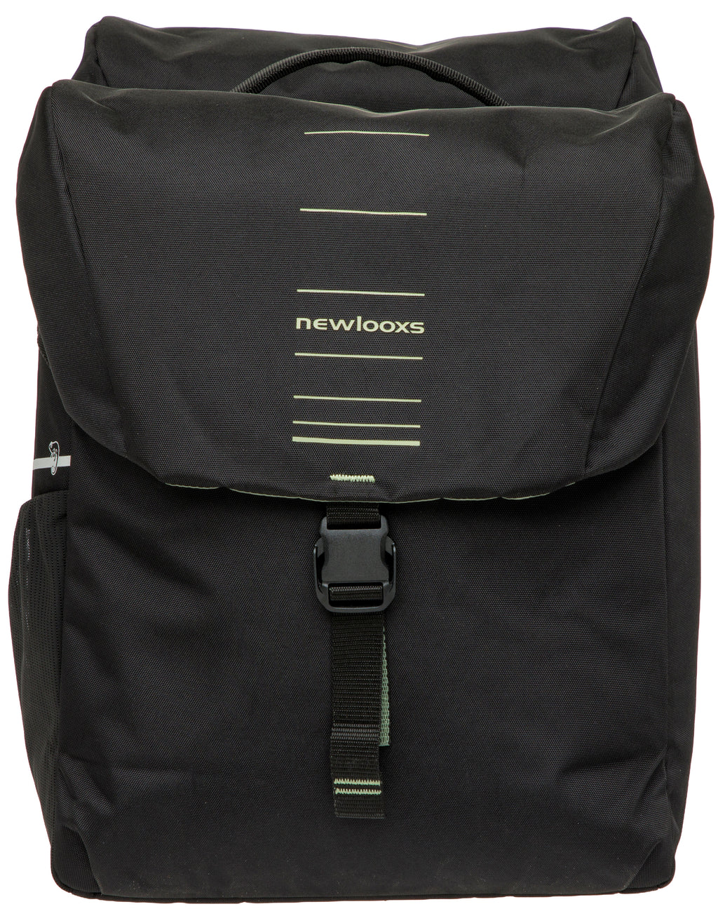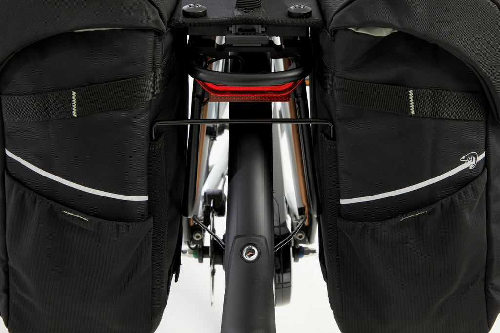 Deze populaire tas is vernieuwd en heeft een frisse look gekregen. Kan iets dat al heel goed is, nóg beter worden? Wij denken van wel! De Vigo Double is een degelijke dubbele fietstas met een sportieve uitstraling. De kleuraccenten op de tas geven de tas een frisse look. Met een handig formaat is deze moderne tas perfect voor dagelijks gebruik. Deze tas is geschikt voor fietsen met een MIK bagagedrager. De dubbele tas beschikt over 2 hoofdvakken en 3 extra vakken. Vigo is gemaakt van gerecycled polyester, een bewustere keuze. De bijgeleverde regenhoes zorgt ervoor dat alles droog blijft. Praktisch en sportief design Wie veel kilometers maakt, mag hoge eisen stellen aan een fietstas. De Vigo Double heeft veel praktische kenmerken. De hoofdvakken van de tas sluit je met een aansnoersluiting. Vervolgens sluit je de klep eenvoudig met kliksluitingen. Deze sluitingen van deze tas openen en sluiten extra makkelijk. Fijn als je je handen vol hebt met boodschappen, of last hebt van bijv. reumatische klachten. De tas heeft 2 ruime hoofdvakken, elastische zijvakken en 3 extra vakken. Zo neem je alle spullen goed georganiseerd mee. Eenvoudige bevestiging met MIK 2.0 De Vigo dubbele fietstas met MIK 2.0 adapter past op MIK bagagedragers. Kijk dus even goed of jij een bagagedrager met MIK-systeem op jouw fiets hebt. Heb je dit niet, dan kun je gebruik maken van een MIK Carrierplaat die je op je bagagedrager bevestigt. De tas heeft een voorgemonteerde MIK 2.0 adapter en wordt geleverd met 2 sleutels waardoor je de tas heel snel op de bagagedrager kunt klikken. Wil je de tas weer van de fiets afnemen, dan kan dit met 1 handbeweging. De kleine sleutel is geschikt als je de tas regelmatig meeneemt en dus van de bagagedrager afhaalt. Deze sleutel is uitschuifbaar en dus langer dan de kleine versie. Deze grotere sleutel is speciaal ontwikkeld voor grotere accessoires, die op de fiets blijven zitten. Je kunt dus kiezen welke sleutel je gebruikt, afhankelijk van of de tas op de fiets blijft zitten, of deze regelmatig van de bagagedrager wordt afgenomen. Het voordeel van het MIK bevestigingssysteem is dat de tas altijd goed bevestigd is op de bagagedrager. Daardoor blijft de tas goed zitten en hangt deze altijd mooi recht. Je kunt de fietstas extra vastzetten aan de zijkant van de bagagedrager met een klittenband riempje. Veilig onderweg De Vigo Double is stevig en vormvast door de kunststof platen in de bodem en achterwand. Daarnaast is de fietstas extra verstevigd met foam. Daardoor blijft de tas goed in vorm en kun je makkelijk je spullen in de tas stoppen. De dubbele Vigo fietstas is gemaakt van waterafstotend gerecycled polyester. Doordat de klep over de tas heen valt, is de tas goed waterafstotend voor kleinere regenbuien. Deze tas wordt geleverd mét bijpassende regenhoes. Zo heb je deze altijd bij de hand en maak je de tas 100% waterdicht. De tas is afgewerkt met reflectie voor extra veiligheid in het donker. Op de zijkanten van de tas zitten bandjes waar je eenvoudig een ledlampje op kunt bevestigen voor extra zichtbaarheid Afstandhouder Je kunt bij de tas een New Looxs afstandhouder gebruiken, deze is separaat te koop. Deze voorkomt dat de tas tegen het wiel aan komt. Je steekt de afstandhouder in de insteekstrips op de achterkant van de fietstas. Dan blijft de tas, ook zwaar beladen, altijd netjes recht op de bagagedrager hangen.