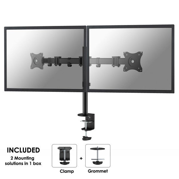 Met deze NewStar monitorarm, model NM-D135 DBLACK, bevestigt u twee flatscreens aan het bureau via een bureauklem. Door gebruik te maken van een monitorarm profiteert u optimaal van de mogelijkheden van uw monitor. De monitorarm is eenvoudig in hoogte en diepte te verstellen. Tevens kunt u het scherm kantelen, zwenken en roteren. Hierdoor creëert u de ideale ergonomische werkhouding. Dit verkleint de kans op nek- en rugklachten. Kabels zijn netjes weg te werken aan de onderzijde van de horizontale arm. De NM-D135 DBLACK heeft 3 draaipunten en is geschikt voor schermen t/m 27" (69 cm). Het draagvermogen van de arm is 8 kg per scherm. Dit product is geschikt voor schermen met een VESA gatenpatroon van 75 x 75 mm of 100 x 100 mm. Heeft u een afwijkend (groter) gatenpatroon, dan kunt u dit oplossen met een van onze VESA verloopplaten.