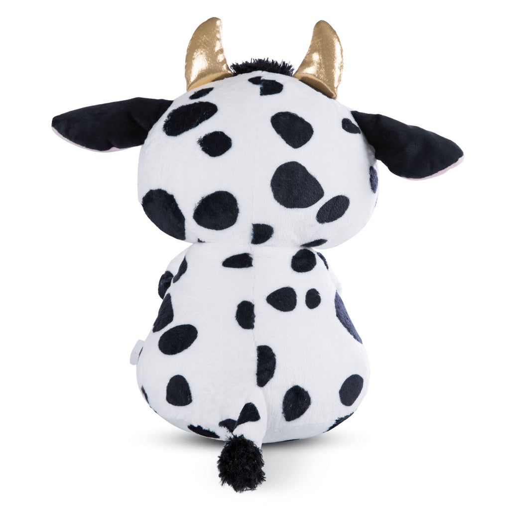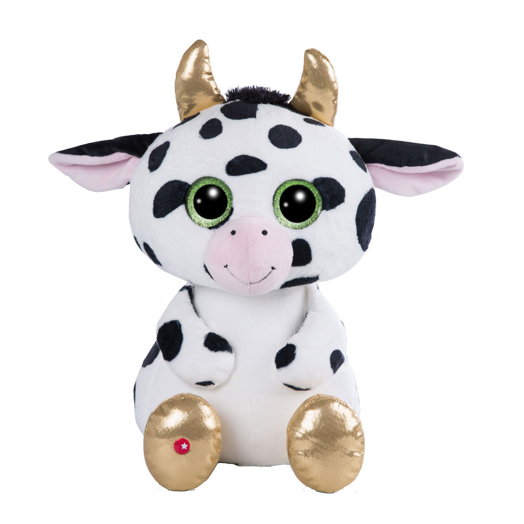 Zwart en wit gevlekt en met goud glinsterende hoorns - dit is de GLUBSCHIS koe Moolon. Perfect voor aan de sleutelhanger van alle boerderijliefhebbers.