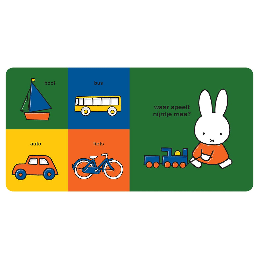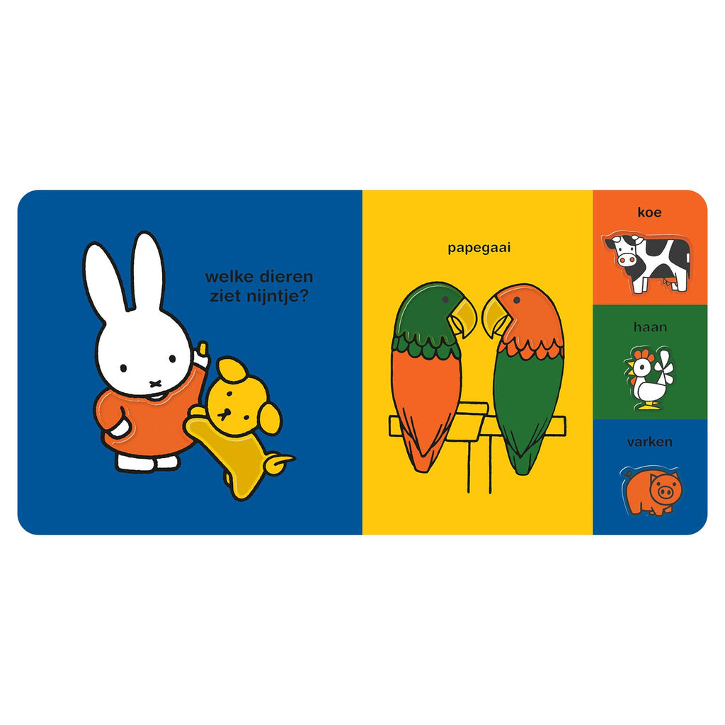 Nijntje kijkt om zich heen. Kijk je mee? Wat zie je in huis? En welke dieren zie je? Op elke pagina in het boek zitten stansvormen in verschillende groottes en vormen die de motoriek van jonge kinderen stimuleren. Leuk om aan te wijzen en woordjes te leren.