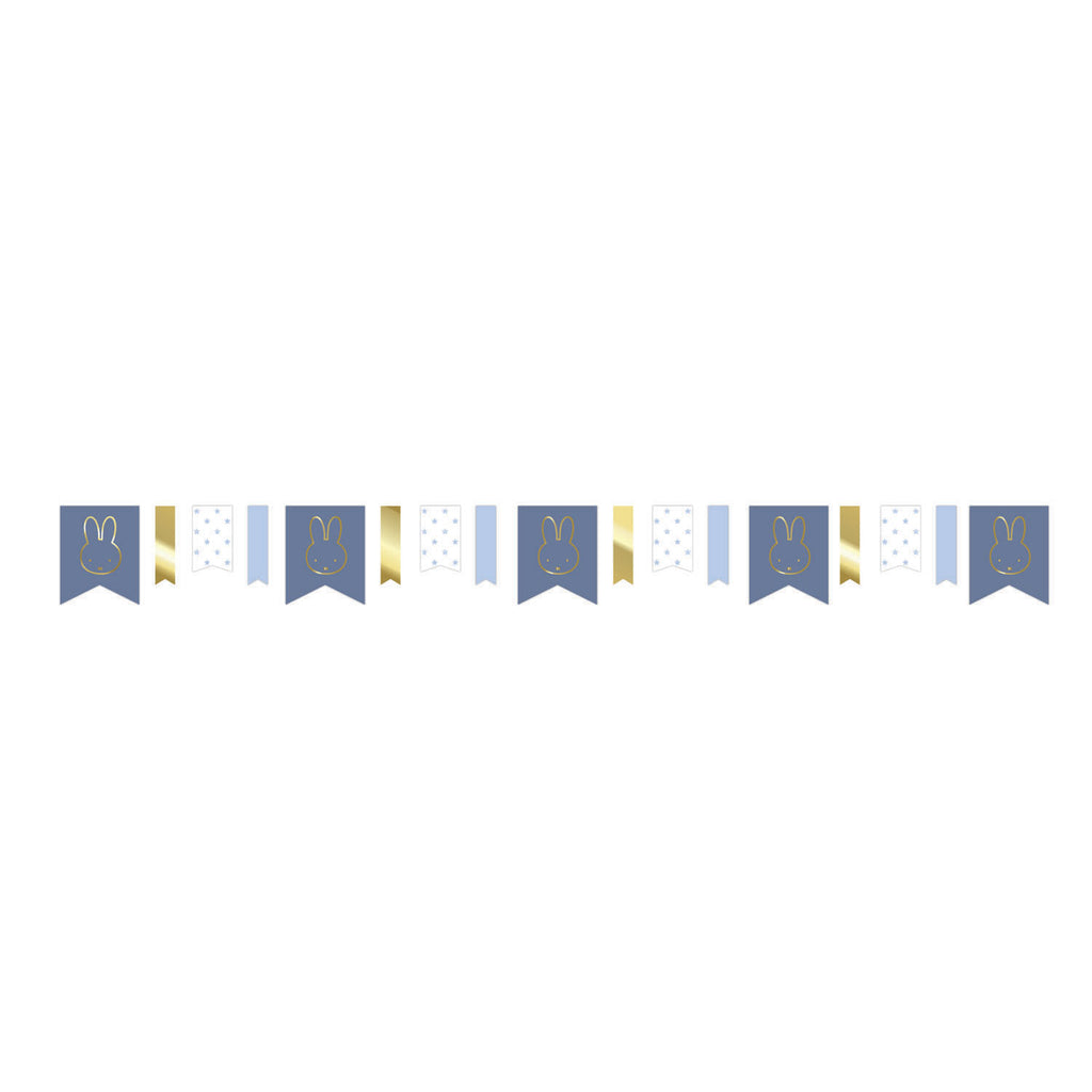 Deze Nijntje slinger met blauwe, gouden en wit met blauw gestipte vlaggetjes maken het feestje helemaal compleet. Leuk om te gebruiken als de kleine helemaal gek is op dit witte konijn of omdat deze feestartikelen van Nijntje er gewoon prachtig uit zien! Inhoud: 8 stuks. Afmeting: 4 meter. Materiaal: papier.