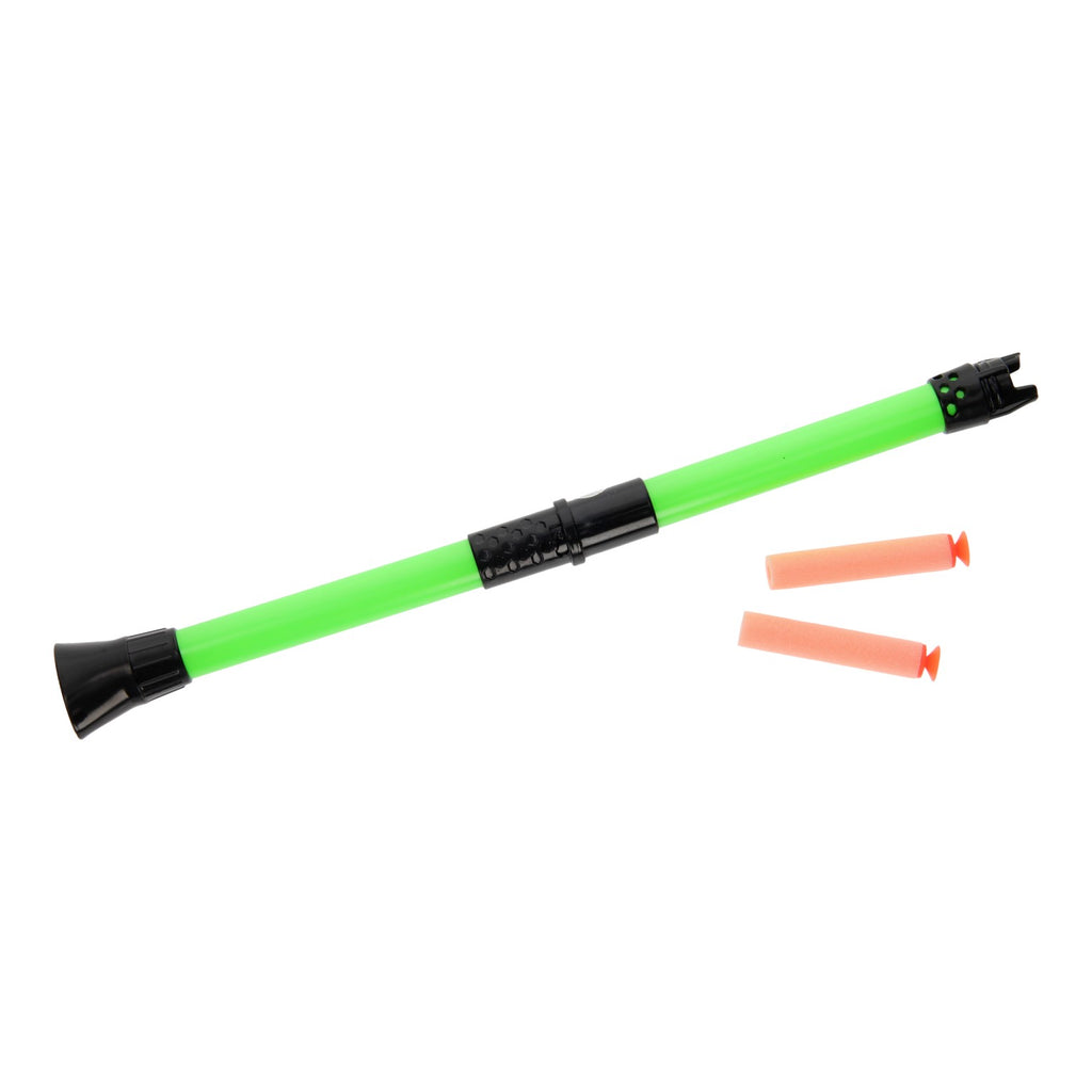 Monteer de twee delen van de blaaspijp op elkaar, doe een schuimpijl in de blaaspijp en blaas zo hard je kan! De schuimpijlen hebben een zuignap, zodat deze aan gladde oppervlakken kunnen blijven plakken, als je goed richt. Hoe ver komt jouw schuimpijl? Inhoud: 2 delen van de blaaspijp en 2 schuimpijlen met zuignappen.