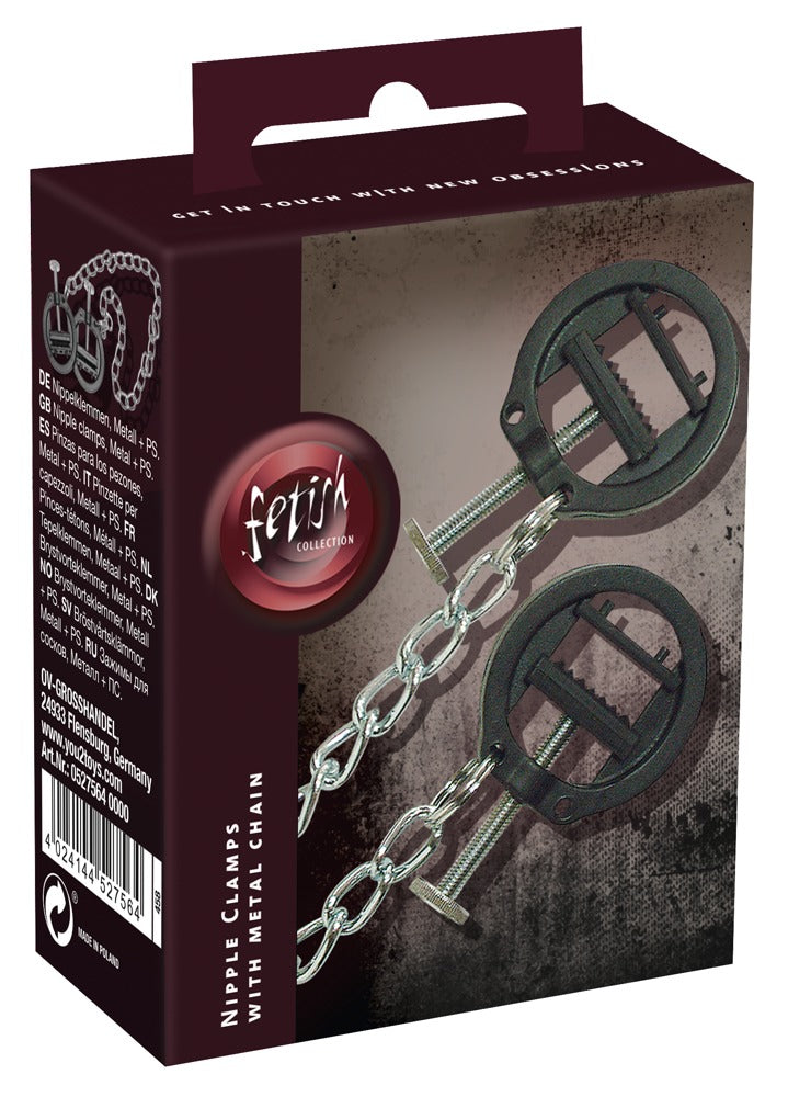 2 zwarte, ronde tepel schroefklemmen, verbonden met een vederlichte metalen ketting. De druk van de klemmen kan individueel worden ingesteld.