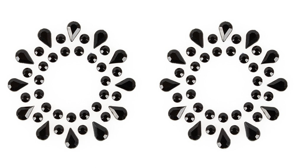 10 x set van 2 tepelstickers met zwarte iriserende edelstenen, uitsparing in het midden voor de tepel. Ø 1,5 cm elk.