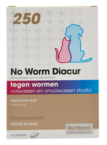 No Worm Diacur 250 mg in 10 tabletten is een ontwormingsmiddel voor katten in tabletvorm tegen alle meest voorkomende wormen. Huisdieren kunnen wormen oplopen door het eten van besmette prooidieren en door opname van wormeneieren uit de omgeving. Dit kan al geburen door simpelweg over een besmette plaats te rollen, eraan te snuffelen, of te likken aan de grond of ontlasting! Ook door het drinken van moedermelk kunnen kittens en pups last krijgen van wormen. Het is daarom belangrijk jouw viervoeter minimaal vier maal per jaar te ontwormen om een wormbesmetting te voorkomen. Met de No Worm Diacur doe je dat gemakkelijk met een tablet, afgestemd op het gewicht van jouw huisdier. Dit wormmiddel zorgt ervoor dat de wormen die in het lichaam aanwezig zijn dood gaan en geen eieren meer kunnen produceren, zodat je een ernstige wormbesmetting kunt voorkomen. Zo blijven jouw dier en zijn omgeving beschermd tegen lintwormen, spoelwormen, haakwormen en zwepwormen.