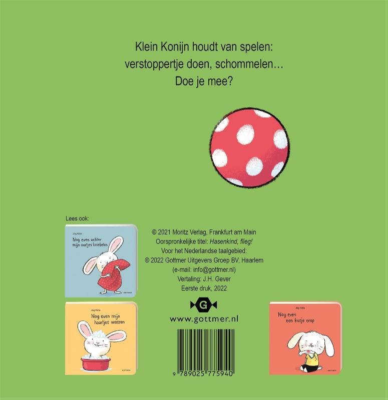 In 'Nog even samen spelen', een lief prentenboekje van Jorg Mühle, wordt voorlezen een interactief spel. Peuters laten zelf het konijntje omhoogvliegen op de schommel en spelen verstoppertje met hem.