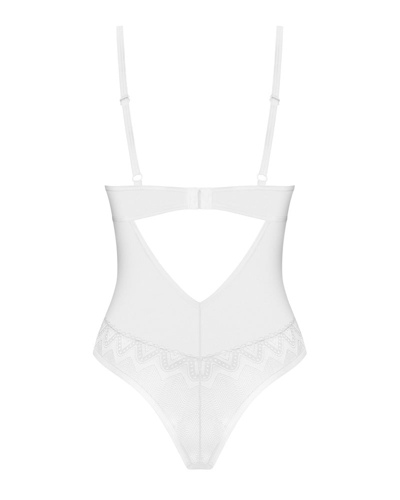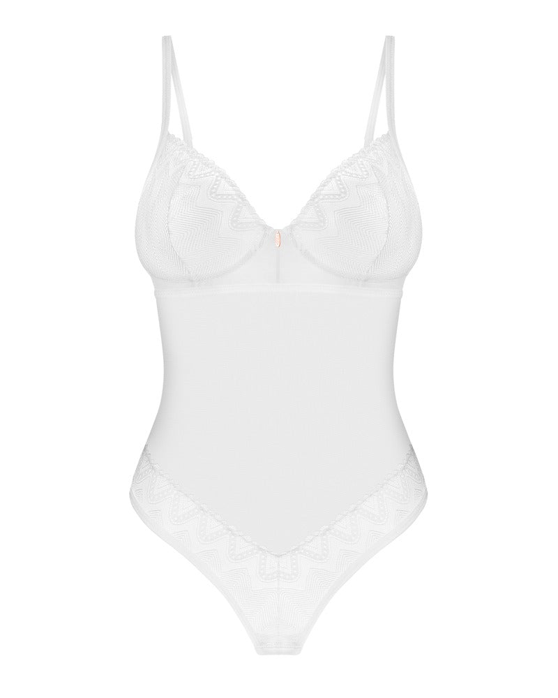 Transparante Alissium bodysuit van Obsessive gemaakt van delicate tule met gestructureerd kant op de cups en het broekgedeelte. In een charmante kleur: tijdloos wit. Overal zacht en rekbaar voor een hoog draagcomfort. Discreet decoratief detail tussen de zachte kanten cups. De bandjes en haaksluiting op de rug kunnen op maat worden versteld.