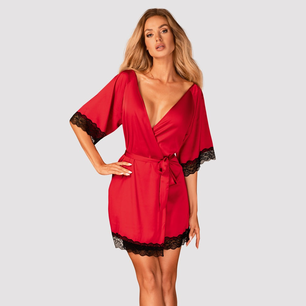 De Sensuelia korte kimono van Obsessive is hét sieraad voor het vrouwelijk lichaam tijdens of na een passionele nacht. Het glanzende satijn omhelst de rondingen en wordt subtiel geaccentueerd door het geknipte en gestrikte lint. De kanten randjes aan de zomen zijn een elegante blikvanger in een contrasterende kleur die de geraffineerde look vakkundig afronden.