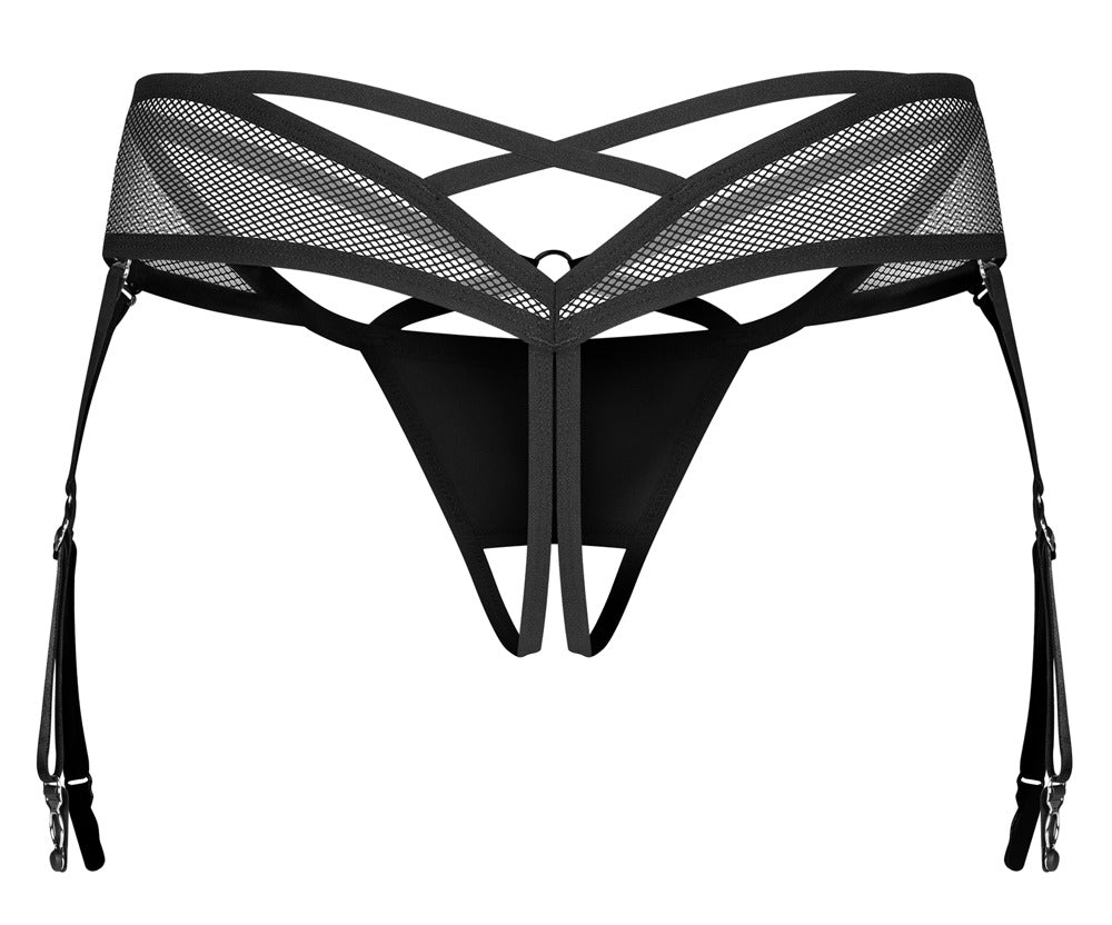 Zwarte kruisloze Dominna jarretel string van Obsessive in een stijlvolle mix van fijn gaas en stijlvolle wetlook. In een extravagante look met elastische bandjes, een ring en een klein sierelement aan de voorkant. De gekruiste jarretelbandjes aan de zijkanten zijn ook geraffineerd. De 4 jarretelbandjes kunnen op maat worden versteld - en zijn ook volledig afneembaar. Verleidelijk open bij het kruis.